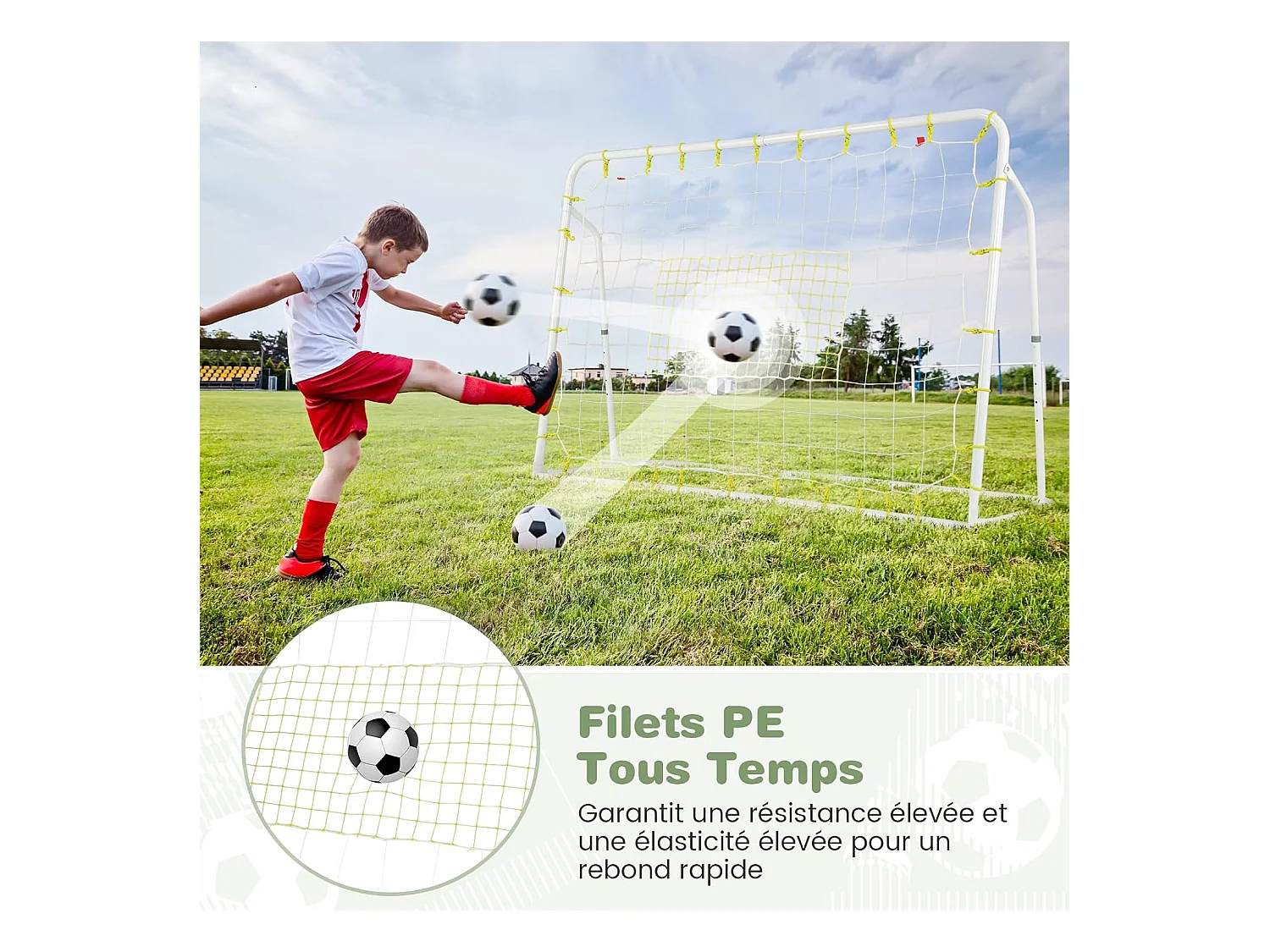 But de Football, Cage de Foot avec Filet Résistant aux Intempéries et Cadre UPVC Piquets de Sol et Cônes de Football (245 x 182 cm)