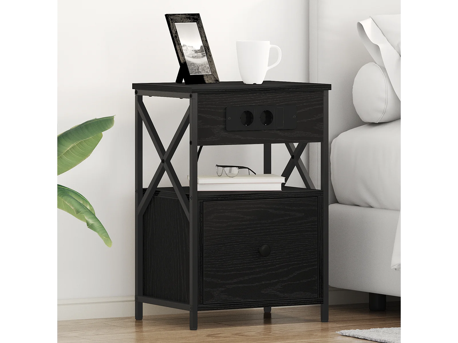 Table de nuit avec station de chargement avec tiroir Chêne noir