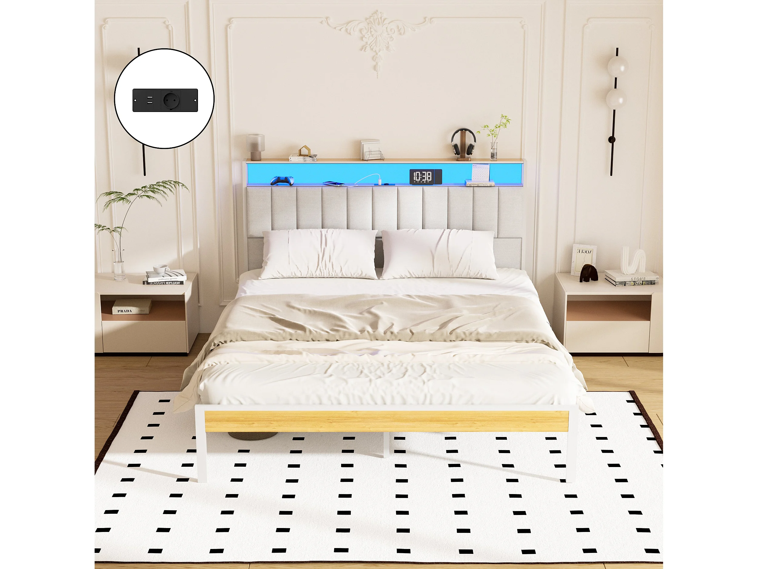 Cadre de lit, 140 x 200 avec Base en métal, avec lumières LED et Prises Multiples (1 Prise AC, 2 Ports USB), lit Double en métal avec casiers, Moderne, Beige