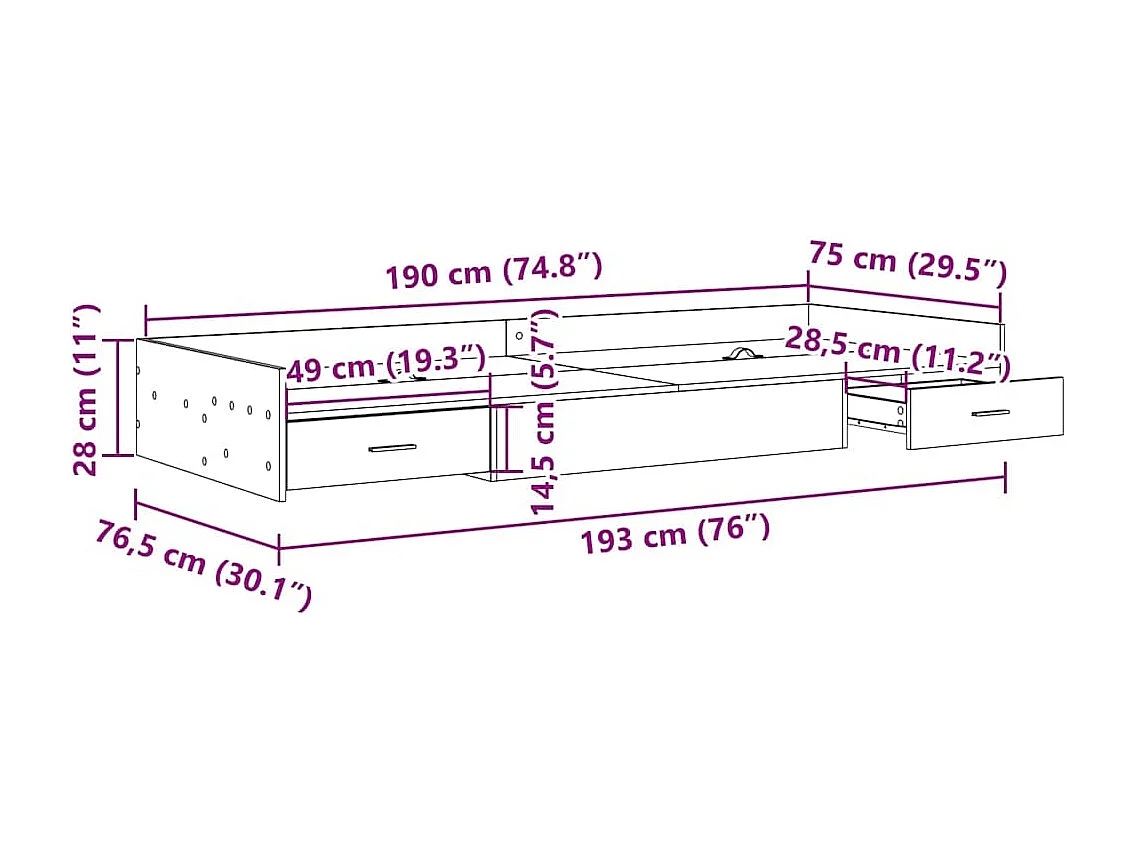 Cadre de lit de jour avec tiroirs Bois ancien 75 x 190 cm