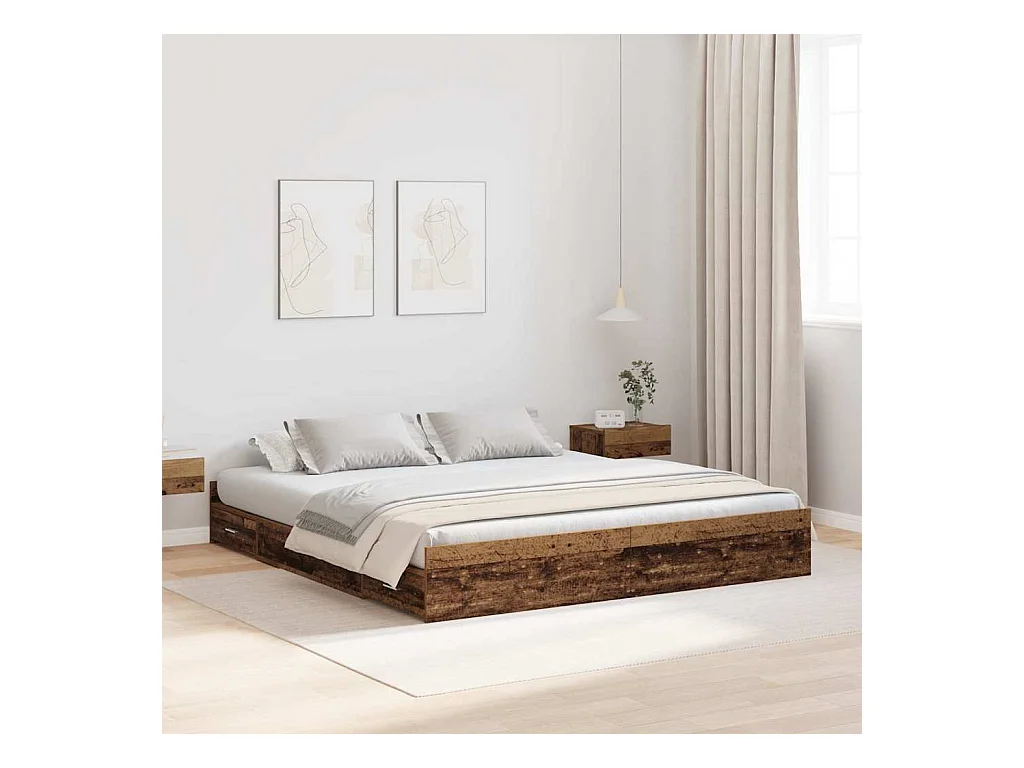Lit double et tiroirs chêne fumé 200x200 cm bois d'ingénierie FR38618