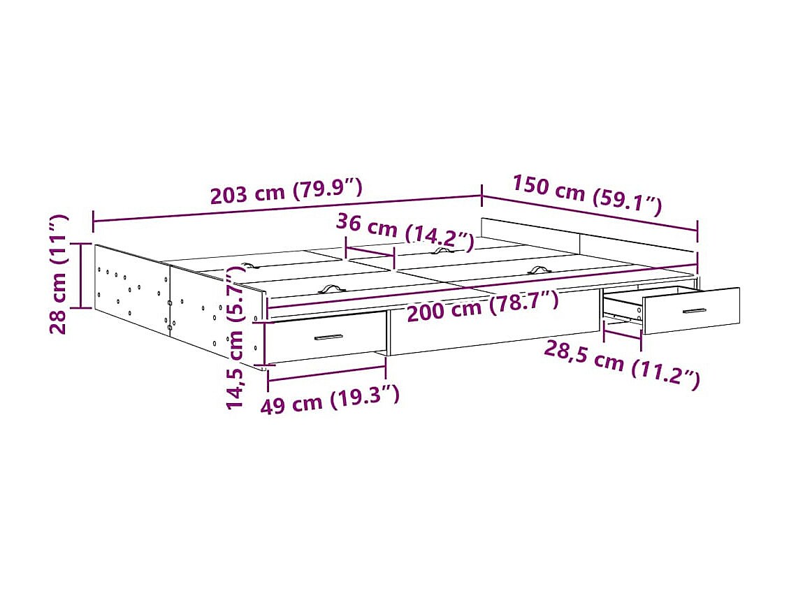 Lit double et tiroirs chêne fumé 150x200 cm bois d'ingénierie FR77281