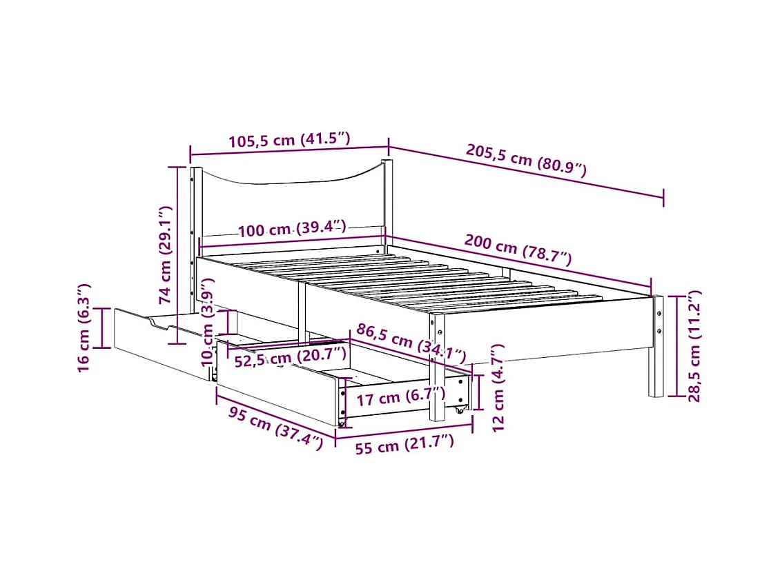 Cadre de lit avec tiroirs blanc 100x200 cm bois massif de pin