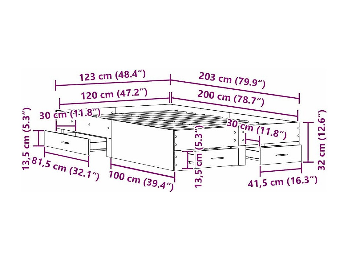 Cadre de lit avec tiroirs chêne artisanal 120 x 200 cm