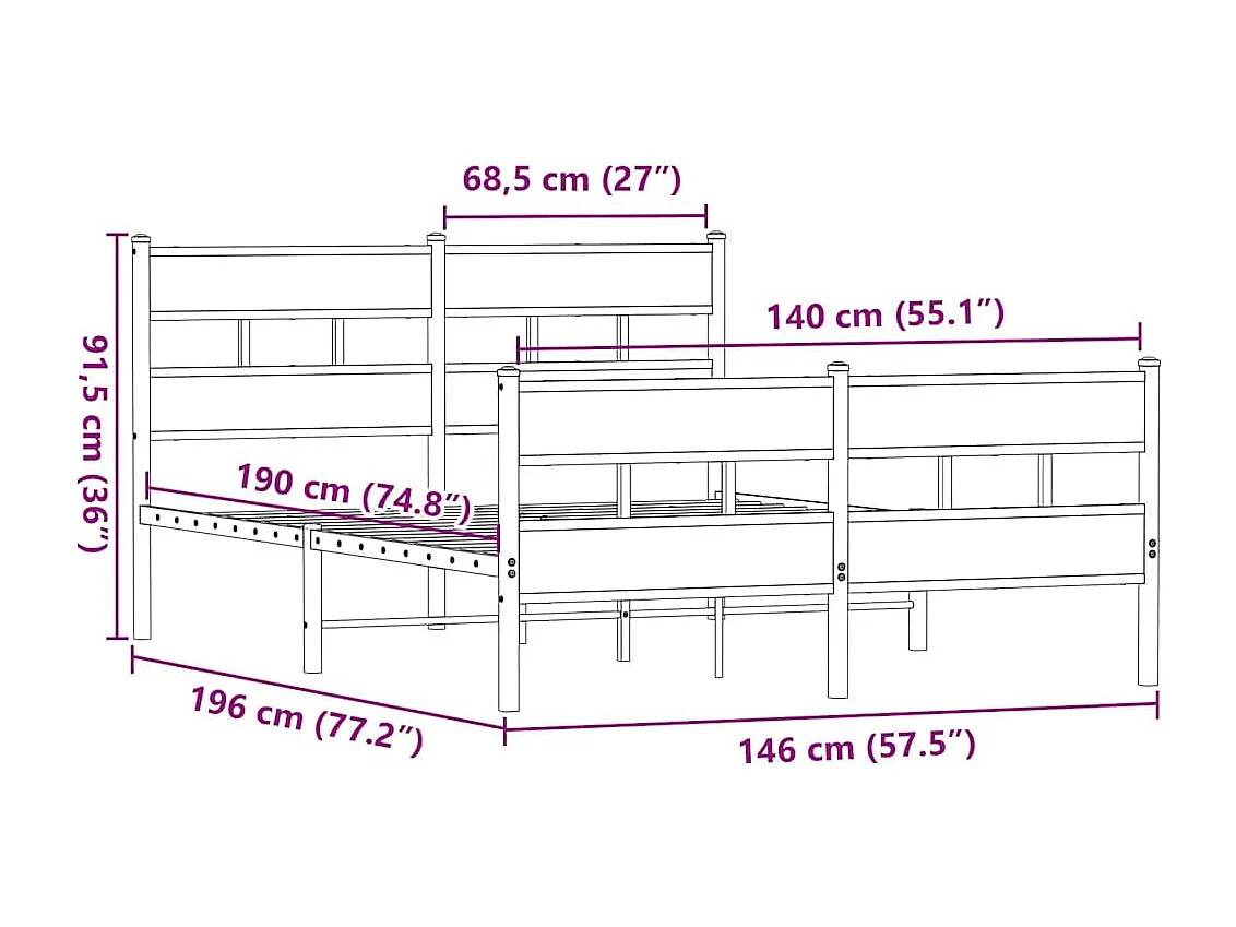 Cadre de lit en métal sans matelas chêne sonoma 140x190 cm