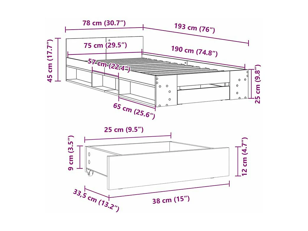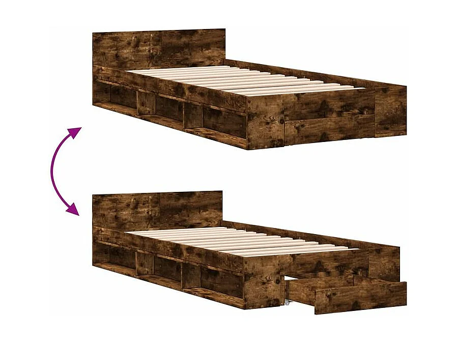 Cadre de lit et tiroir chêne fumé 75x190 bois d'ingénierie