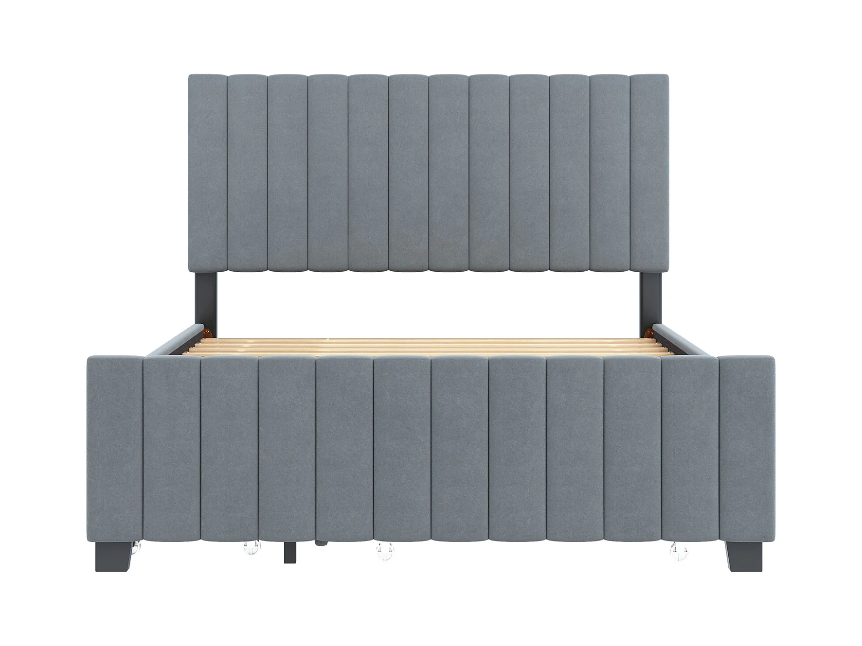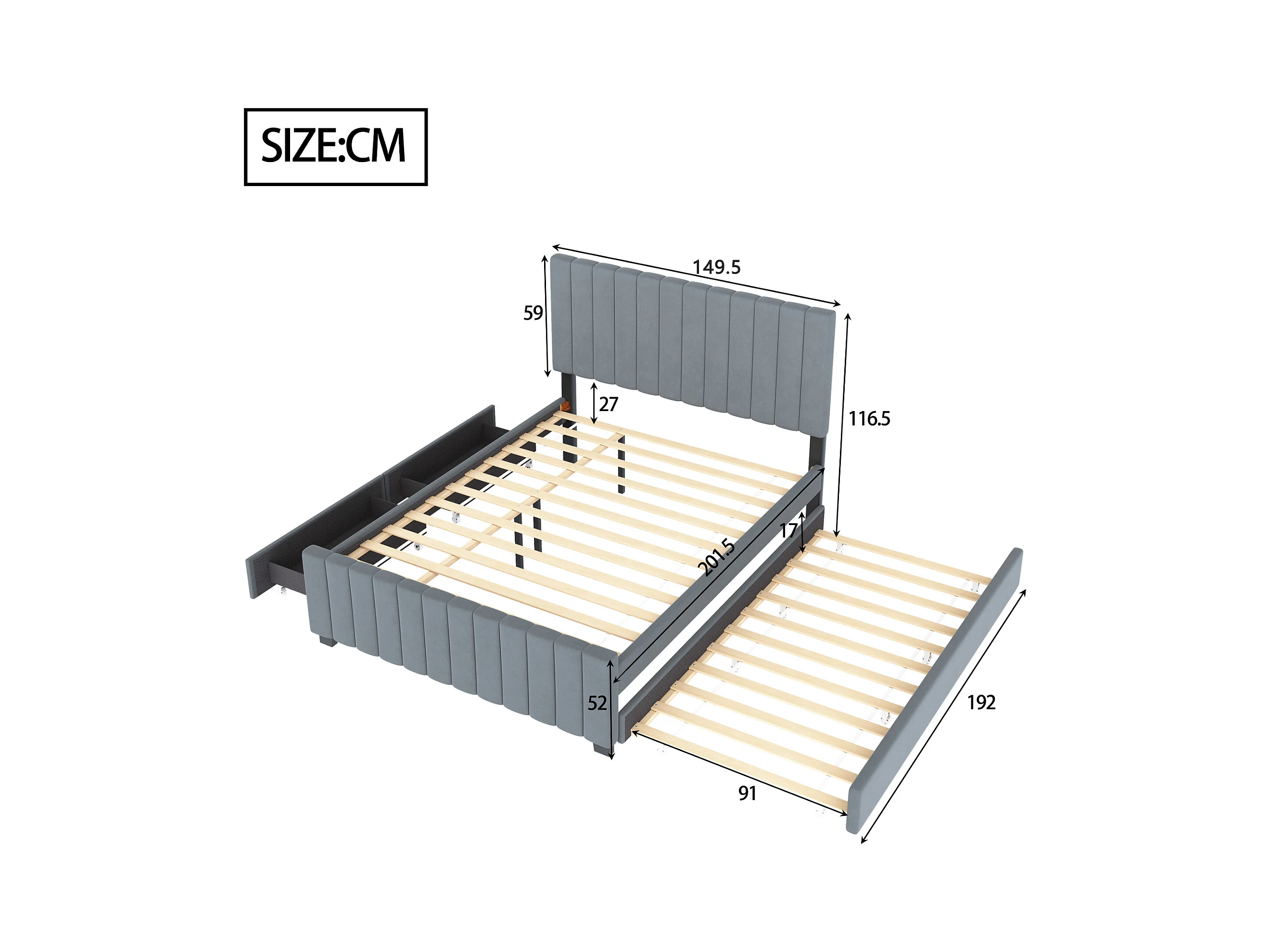Cadre de lit gris 140x190cm avec lit gigogne 90x190cm, lit adulte avec 2 tiroirs, sans matelas