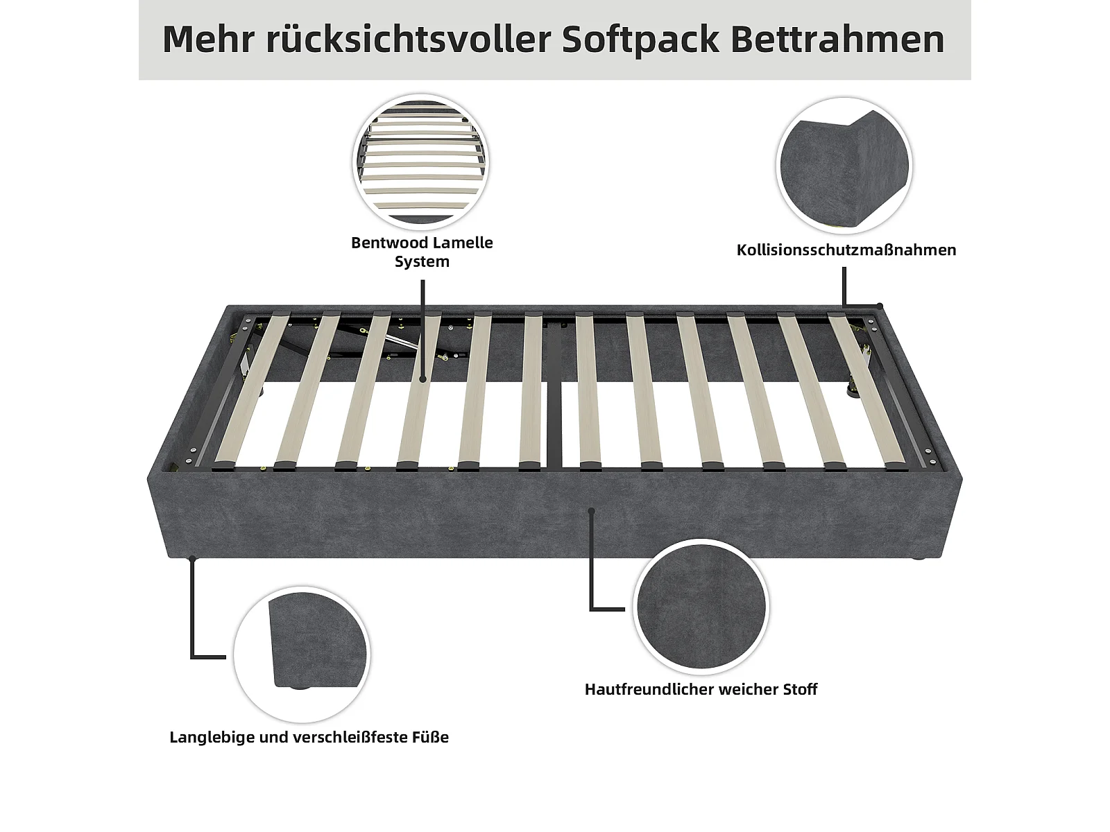 Lit simple 90×200 cm pour enfant, en chenille douce, structure en eucalyptus écologique et métal, montage facile – Dark Gray
