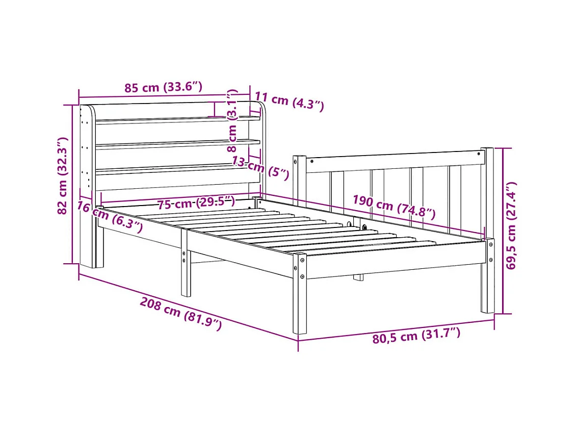 Cadre de lit sans matelas 75x190 cm bois de pin massif