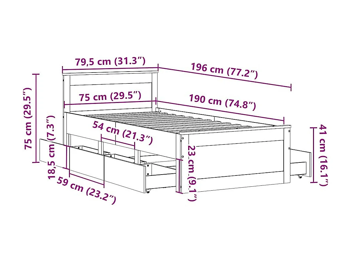 Cadre de lit avec tiroirs sans matelas 75x190 cm