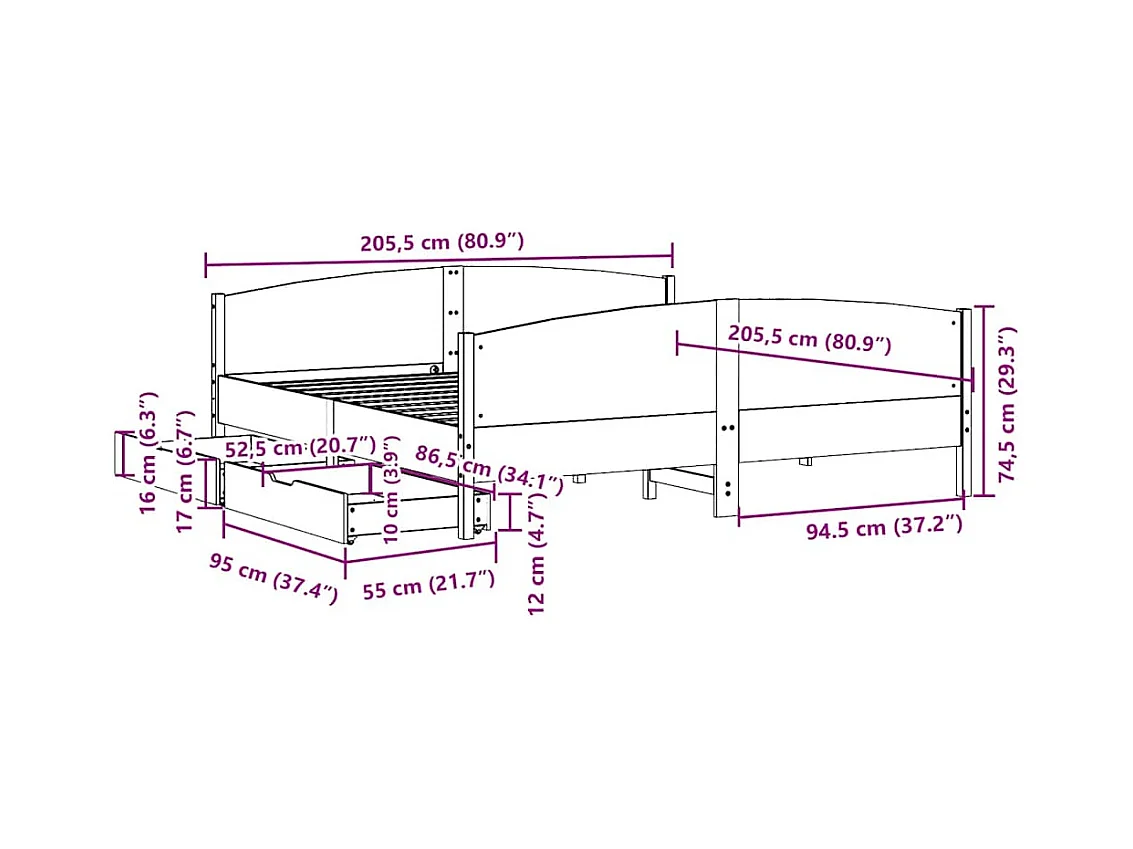 Cadre de lit avec tiroirs blanc 200x200 cm bois massif de pin