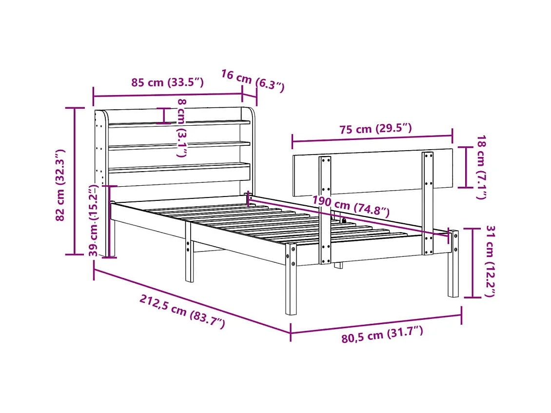 Cadre de lit sans matelas avec tête de lit 75x190 cm pin massif