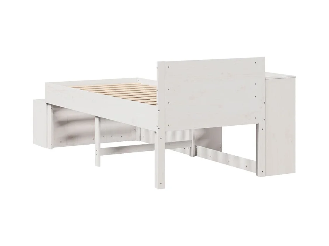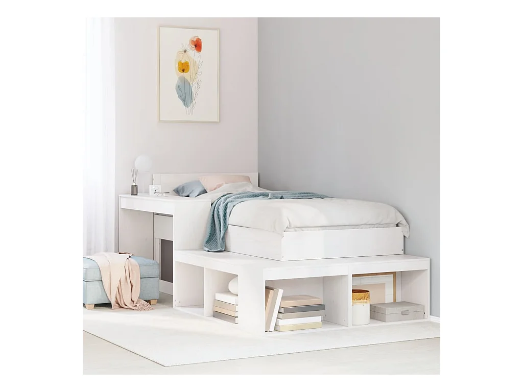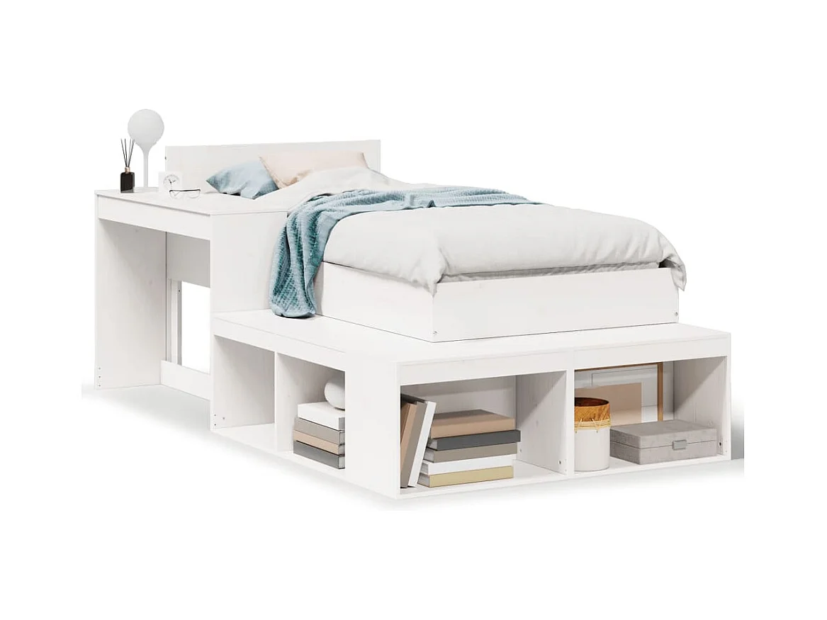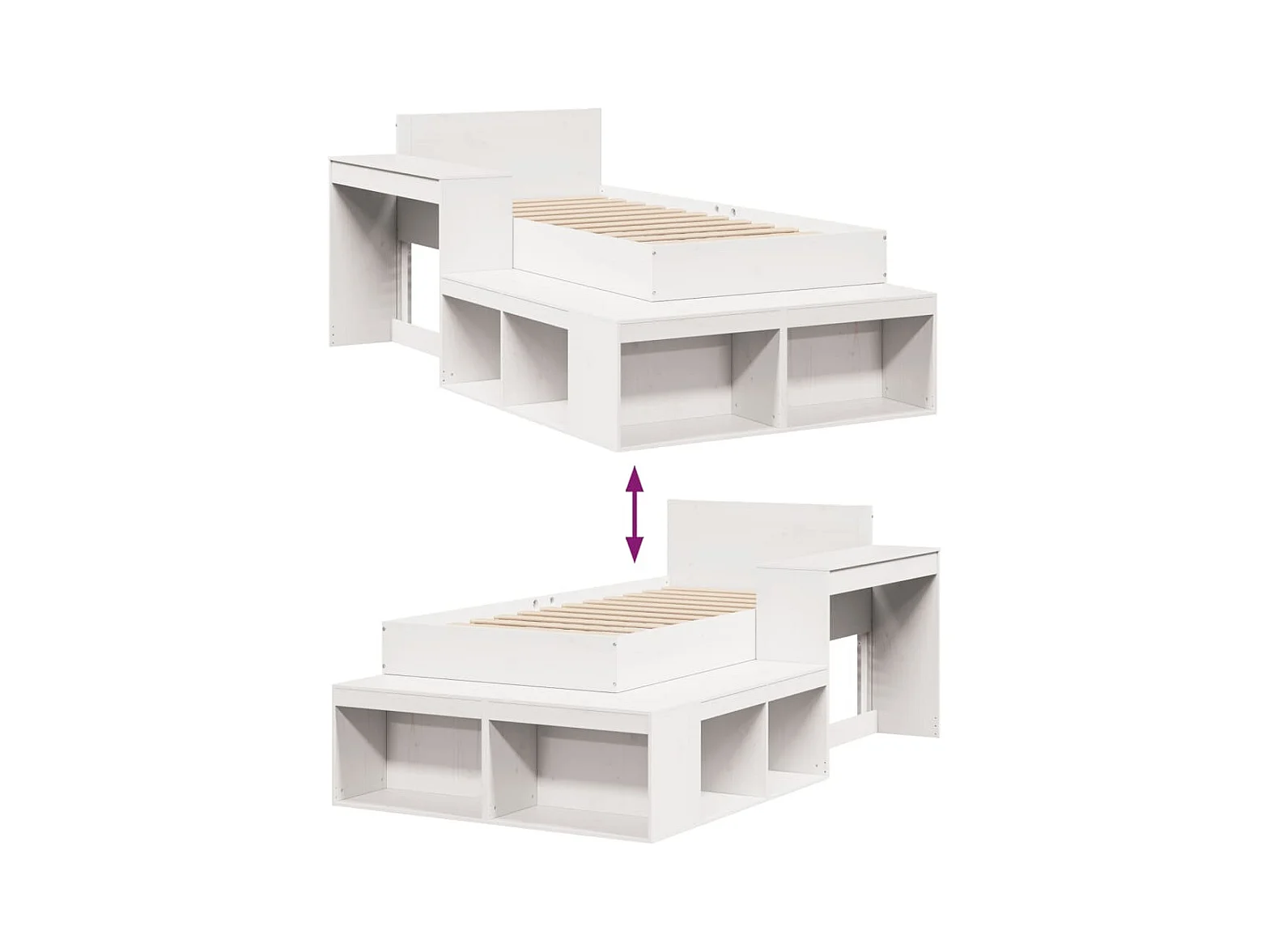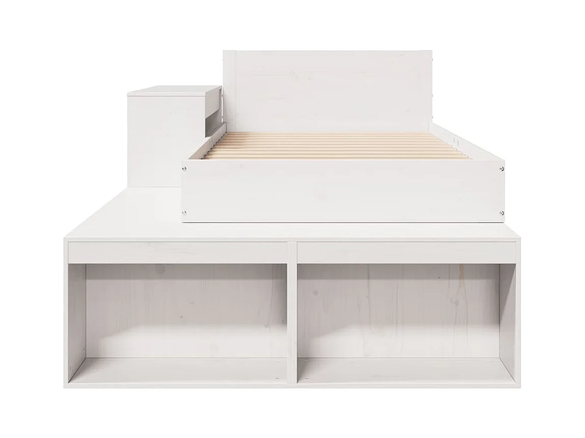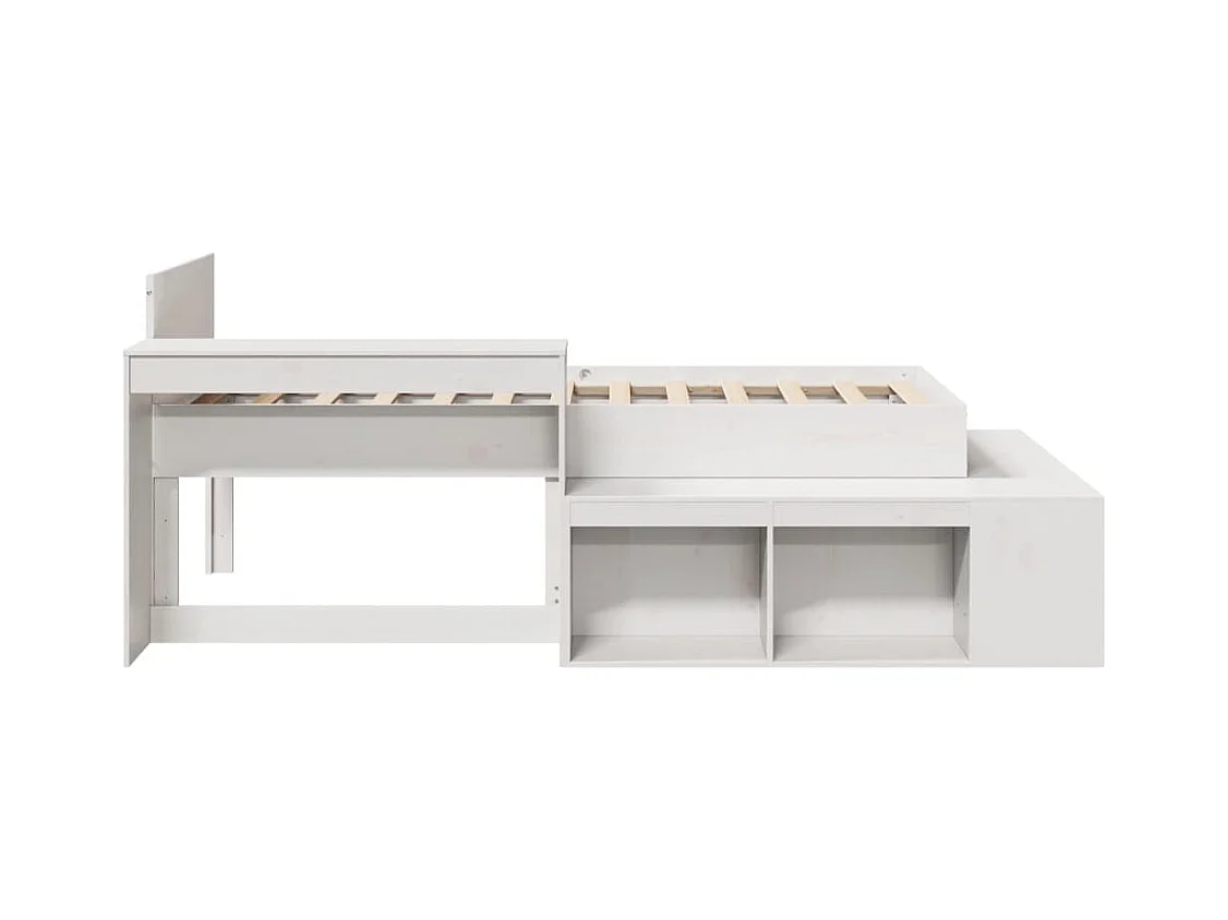 Lit plat avec bureau, tiroirs et étagères, bois de pin, blanc (90x200 cm)