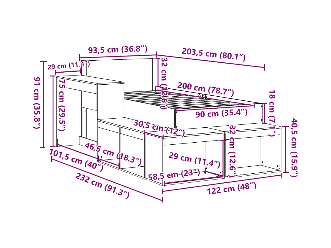Cadre de lit avec tiroirs sans matelas blanc 90x200 cm