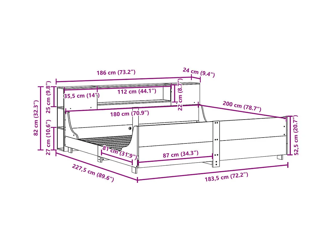 Lit bibliothèque sans matelas 180x200 cm bois massif de pin