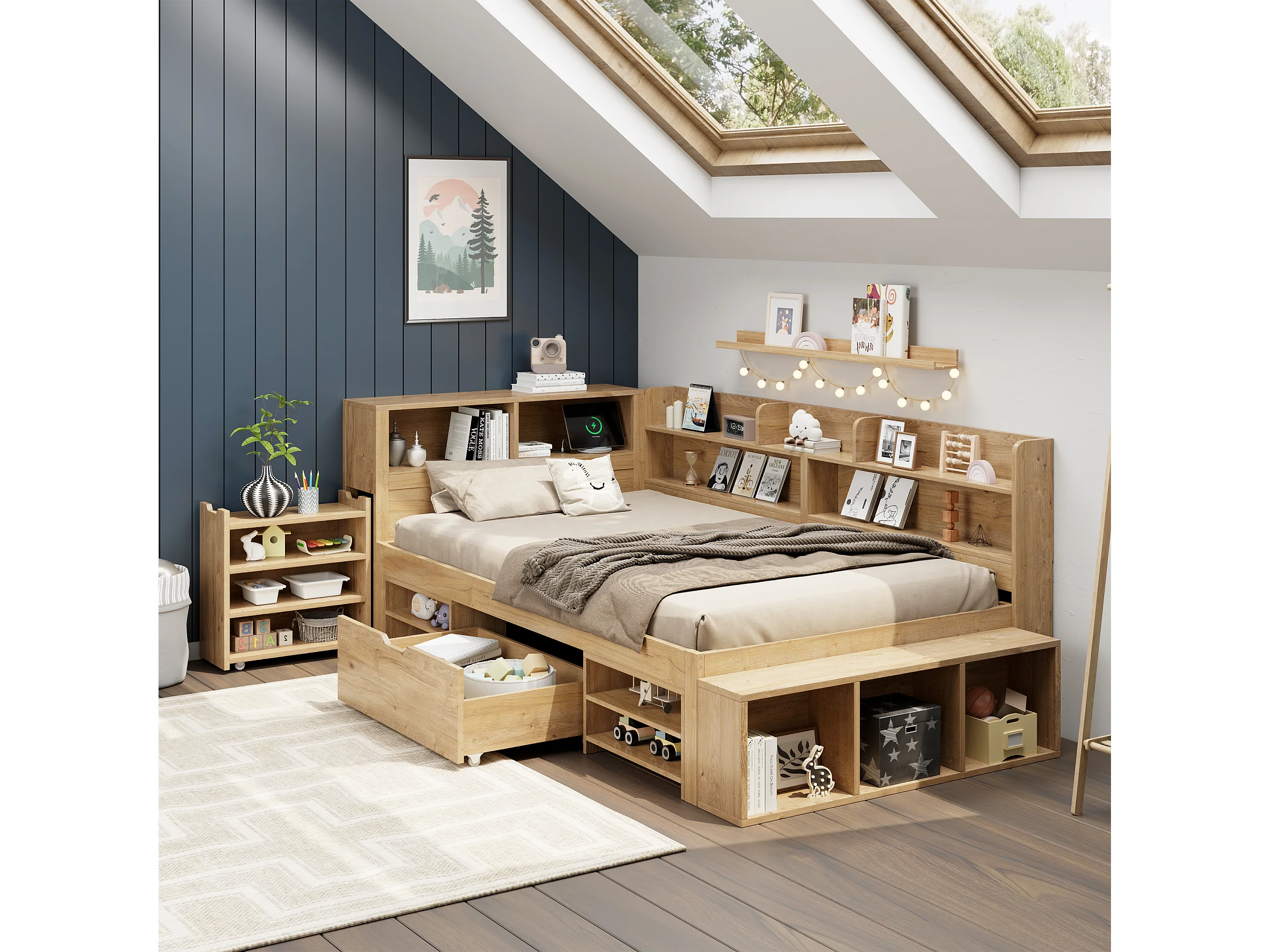 Cadre de lit simple enfant 90x200cm naturel clair avec table de chevet, rangements et recharge sans fil (sans matelas)