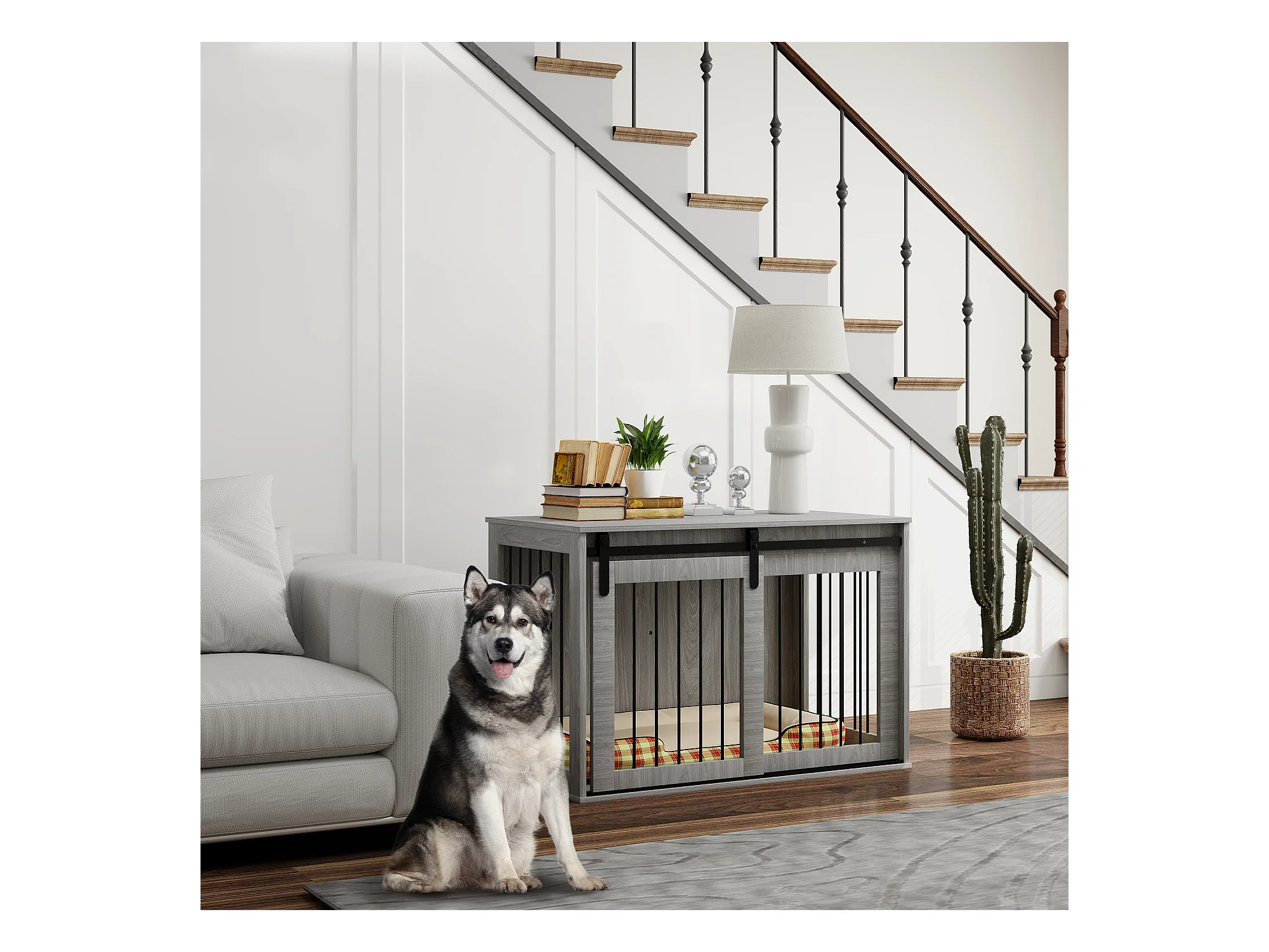 Cage de transport pour chien en bois avec plateau table et coussin, contreplaqué, gris et blanc (85x55x75cm)