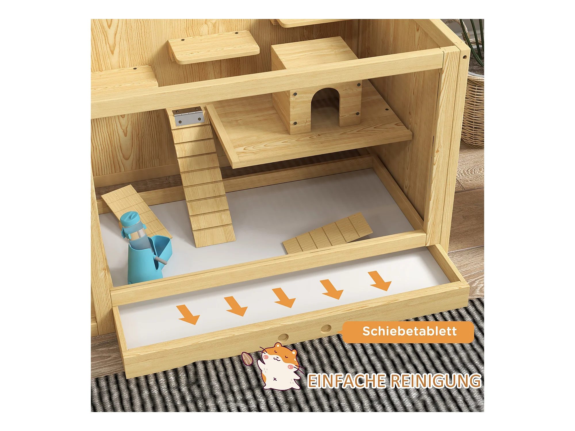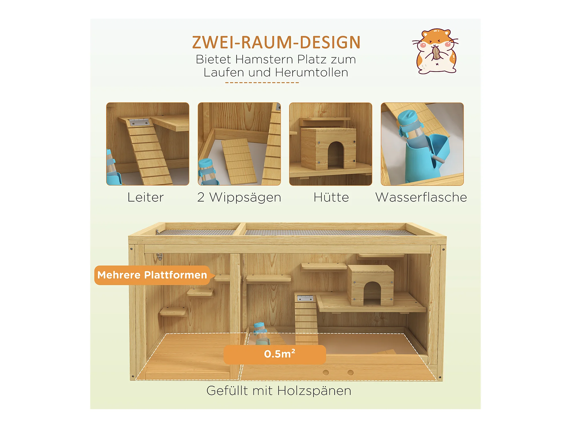 Cage pour hamster nain en bois, design spacieux à 2 étages avec accessoires, bois naturel (87x43x101cm)