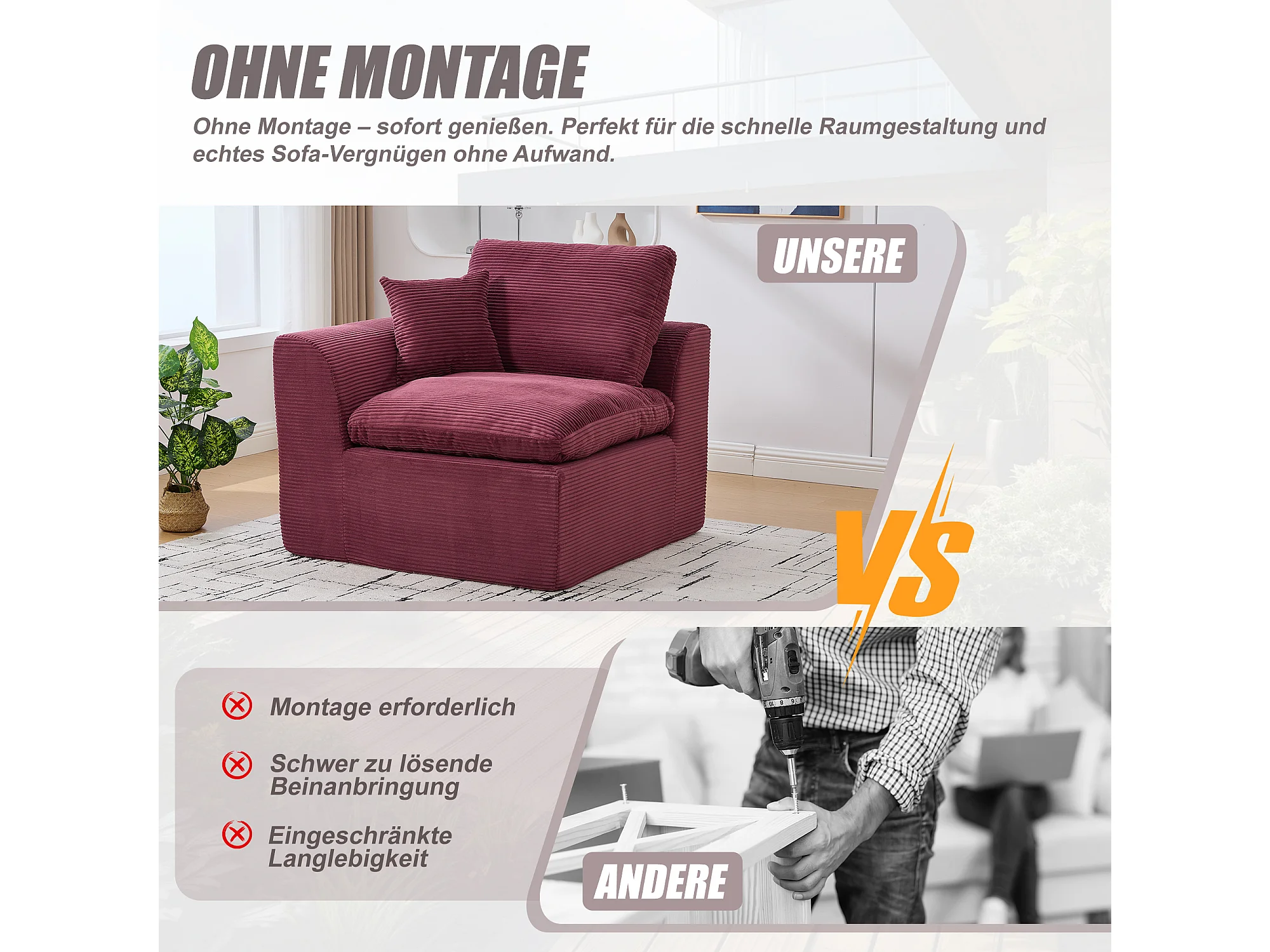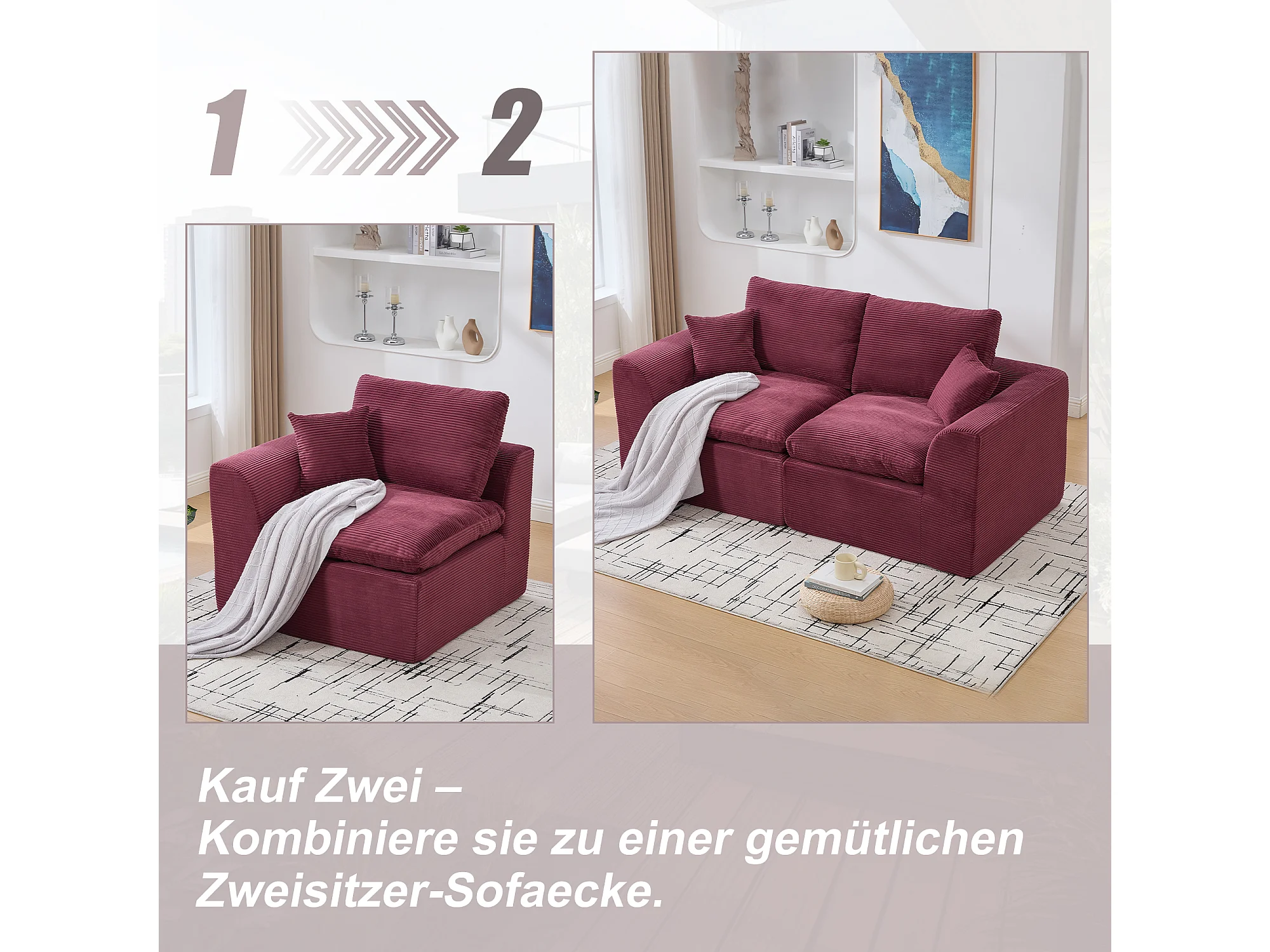 Câlin - Canapé 1 Places Modulable - Canapés d'Appoint en Velours Côtelé - 2 Coussins Ergonomiques Inclus - Ensemble Salon Modulable pour Salle de Séjour