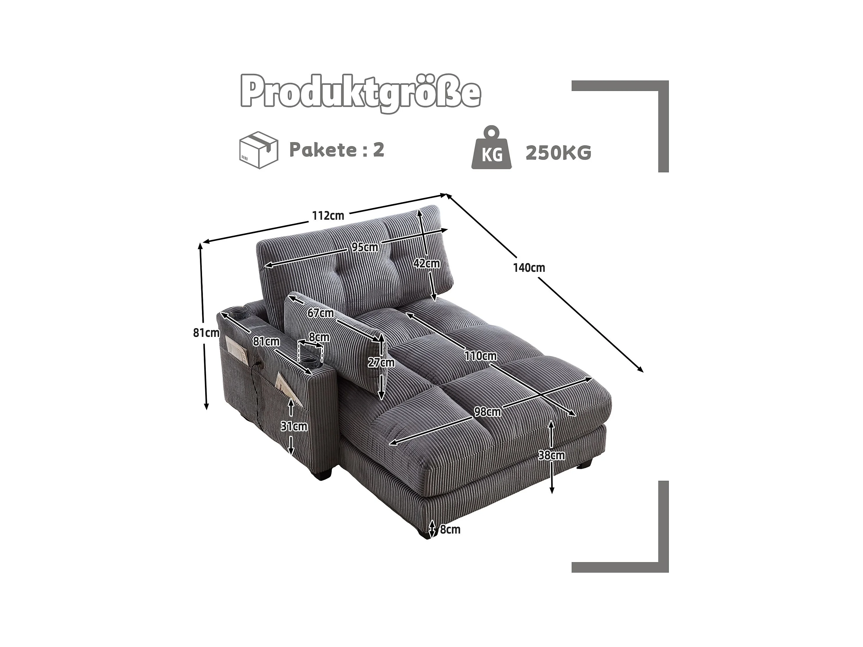 Canapé fixe - Chaiselongue grise en tissu chenille - avec support pour téléphone et rangement intégré - Idéal pour salon, bureau ou chambre