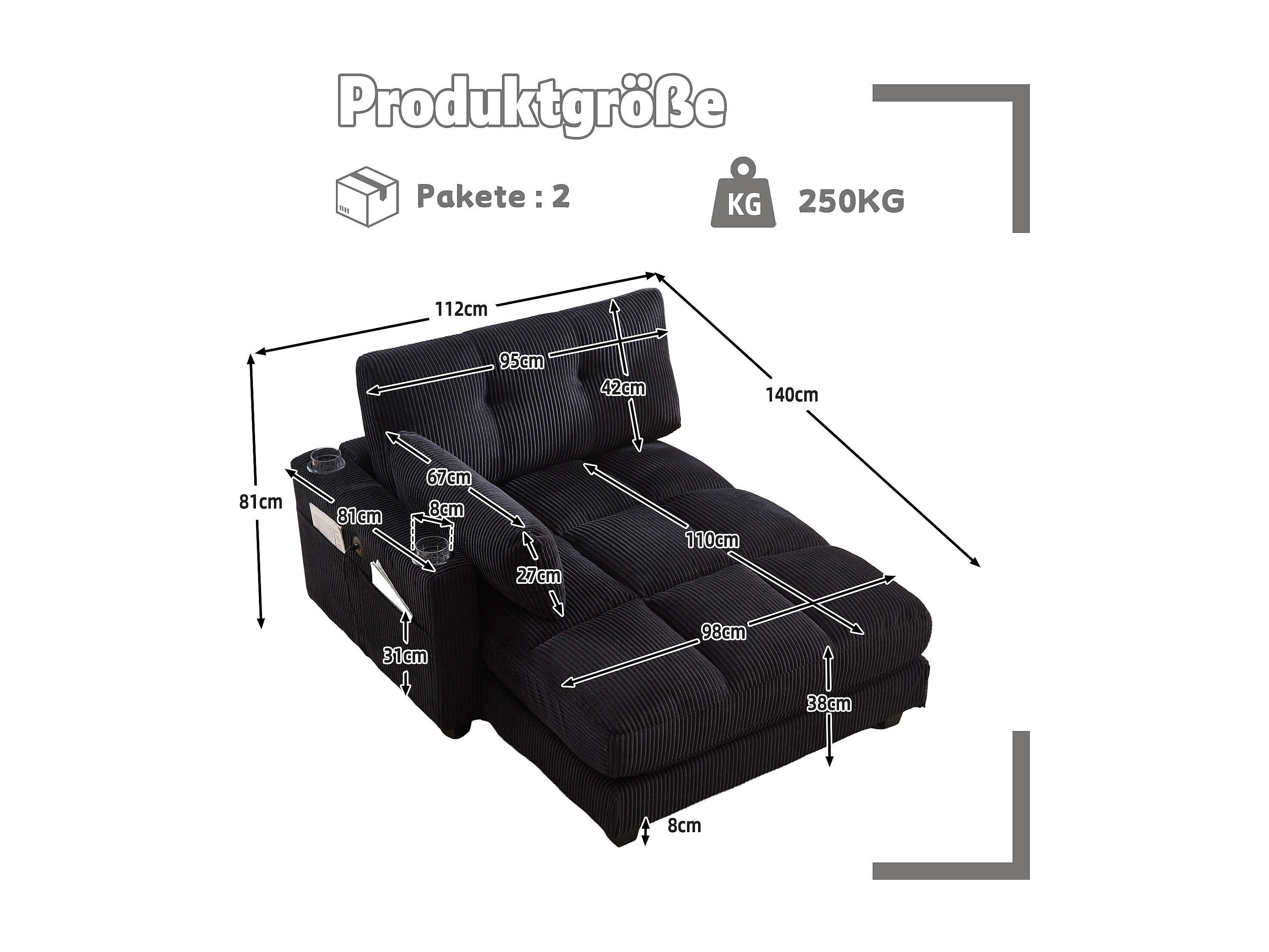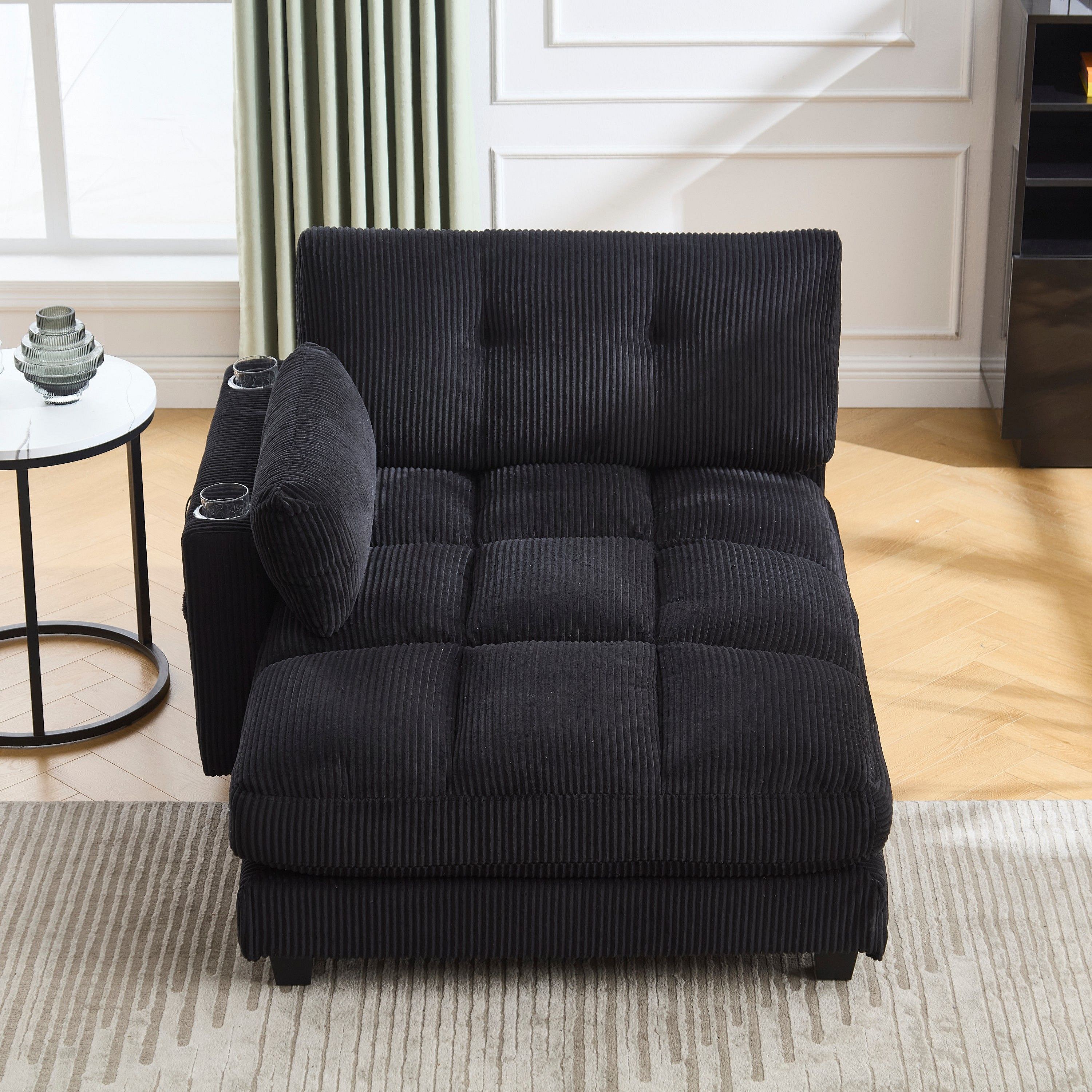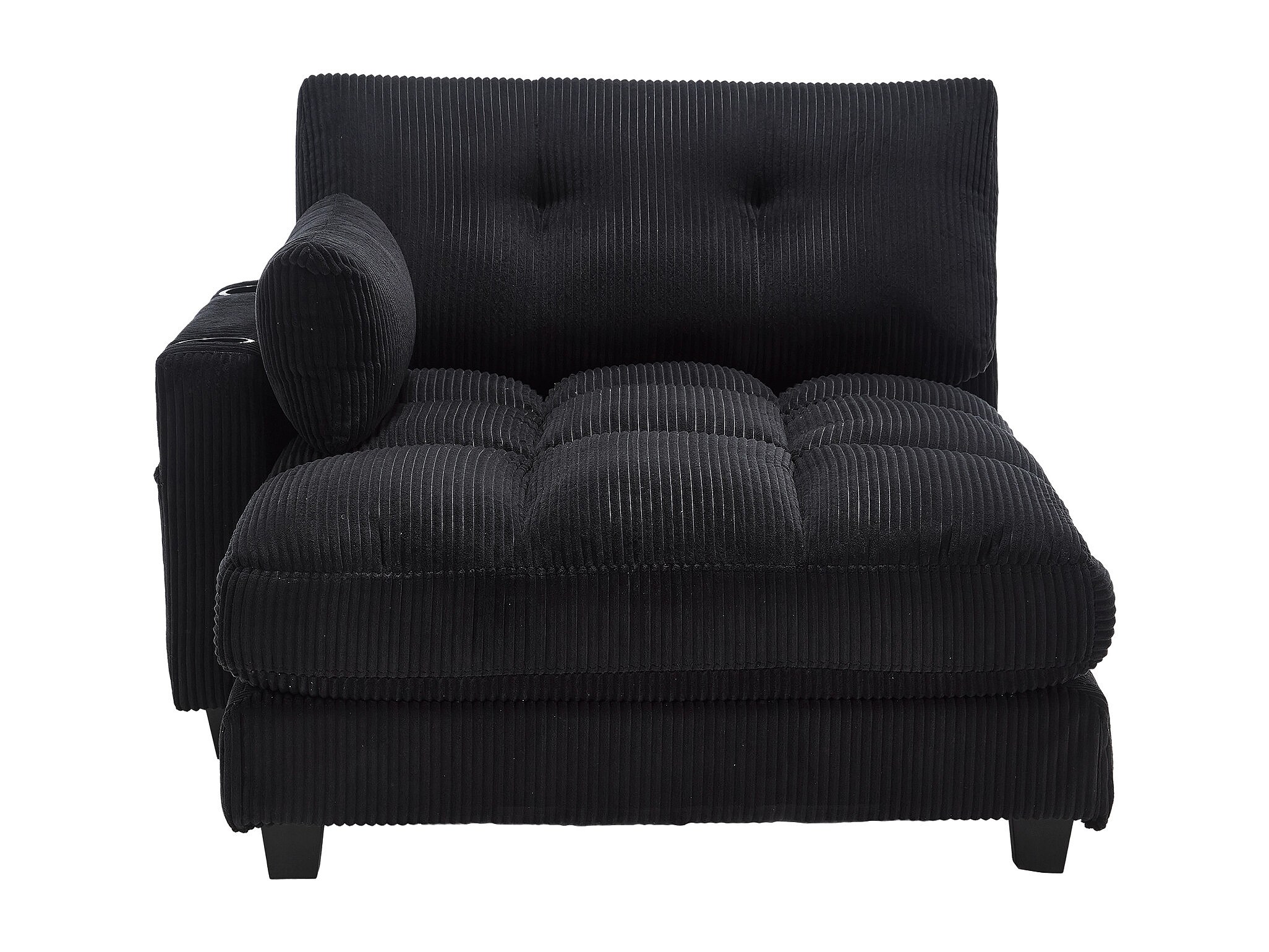 Canapé 1 place avec dossier rembourré, port USB et porte-gobelet - velours côtelé noir