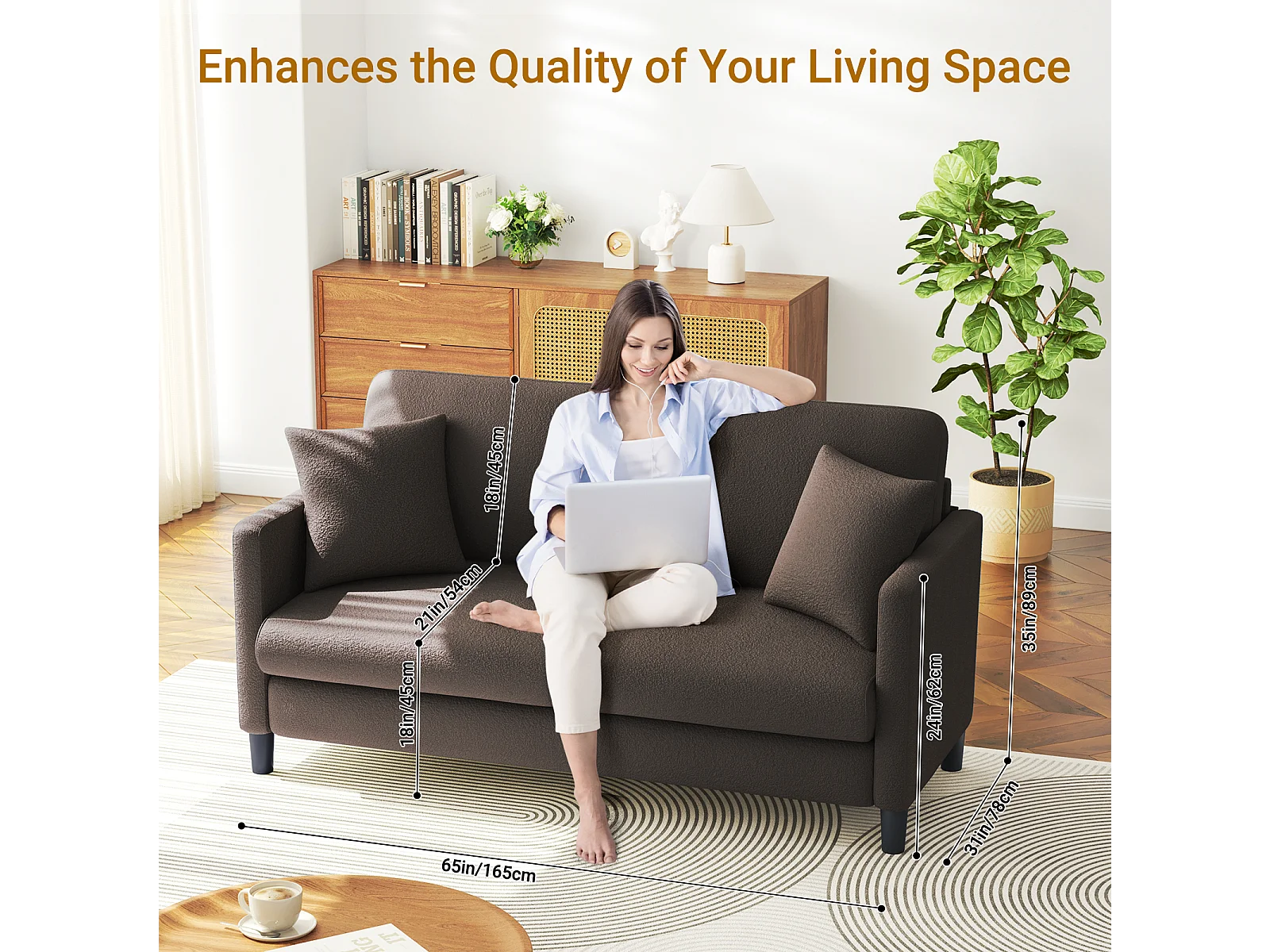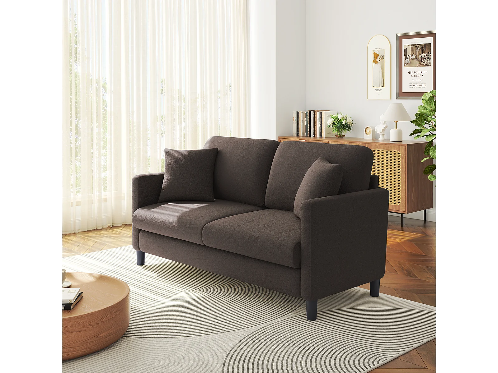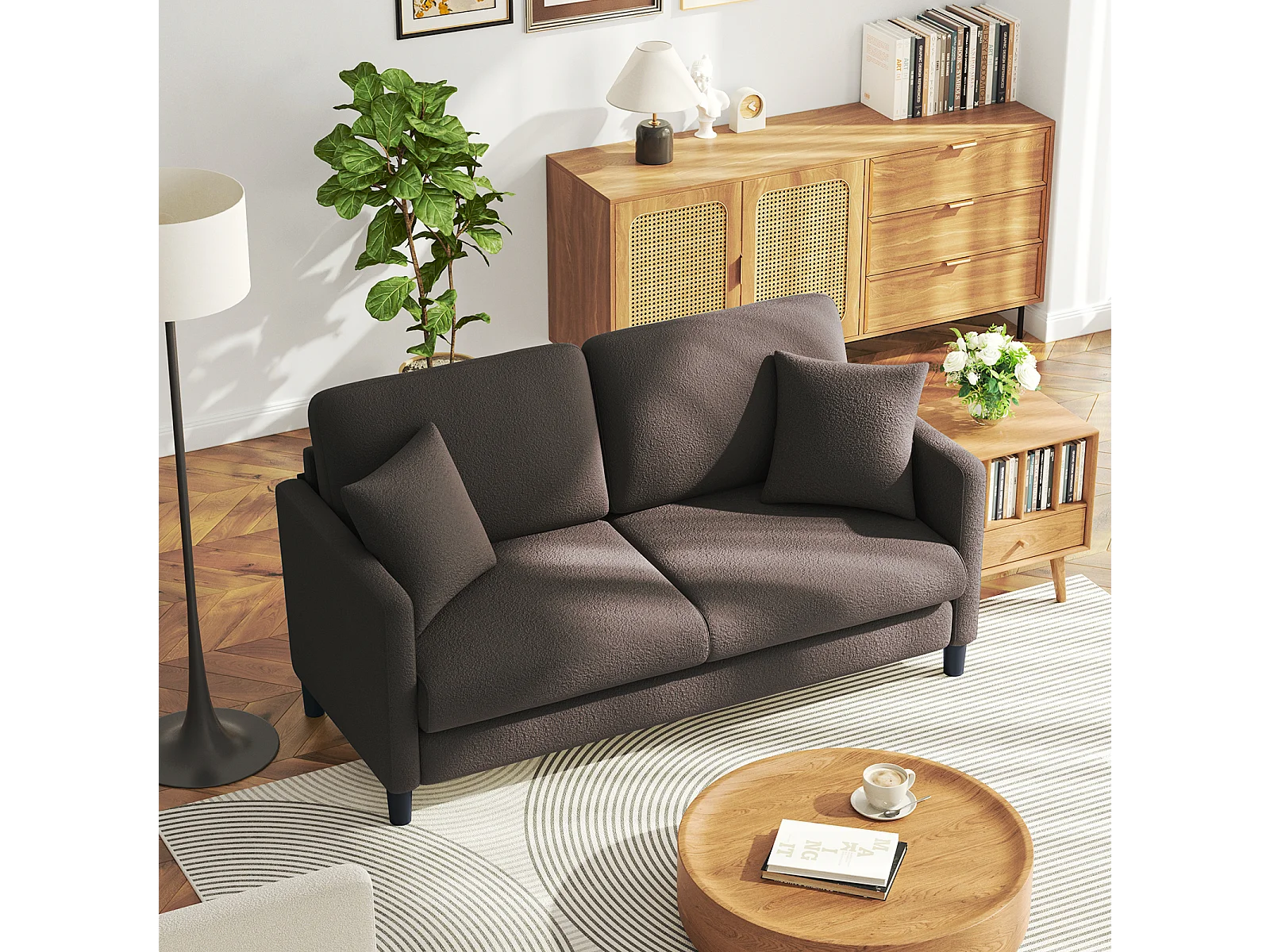 Canapé 2/3 Places en Velours Teddy,Canapé Droit Confort en Bois Massif,Loveseat avec Accoudoirs,165x78x89cm,Marron