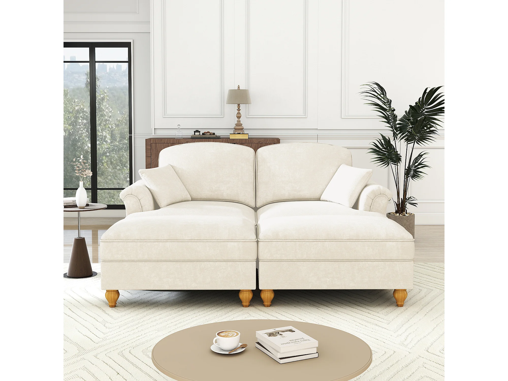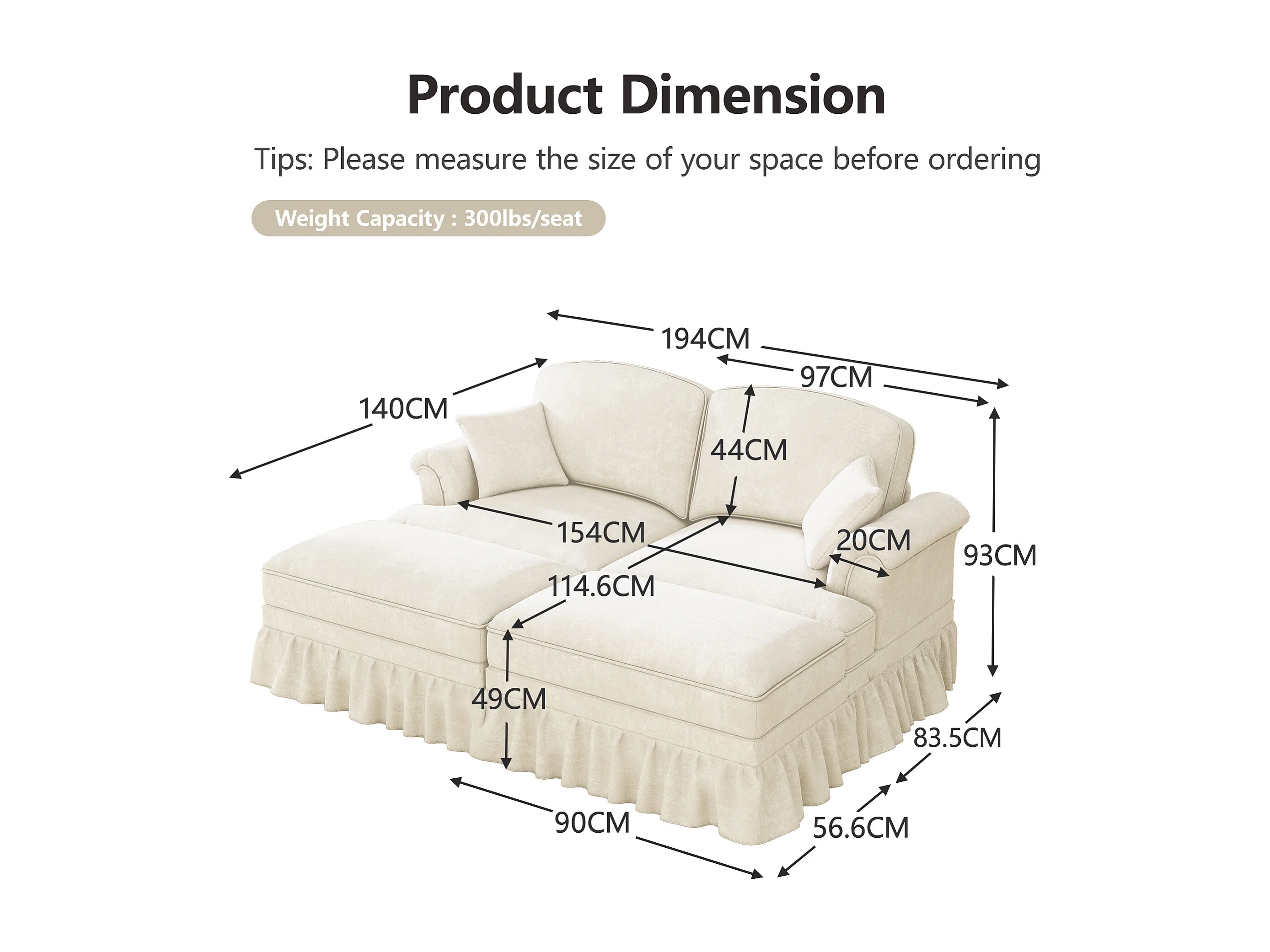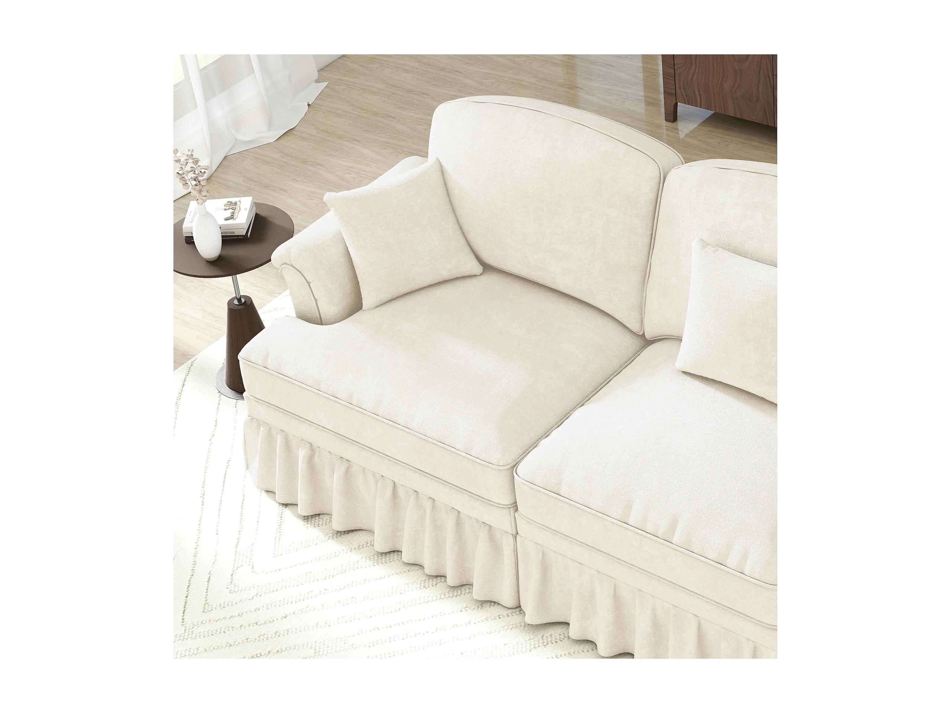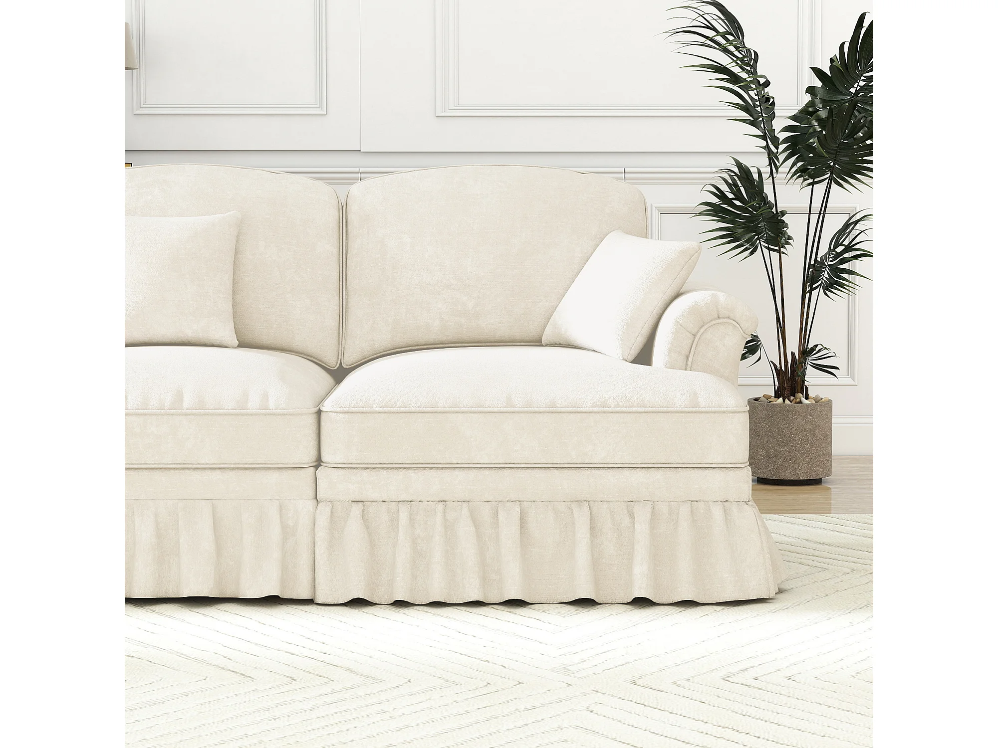 Canapé 2 places chesterfield en chenille beige - avec 2 pouf et 2 oreillers - cantonnière amovible - 194x140x93cm