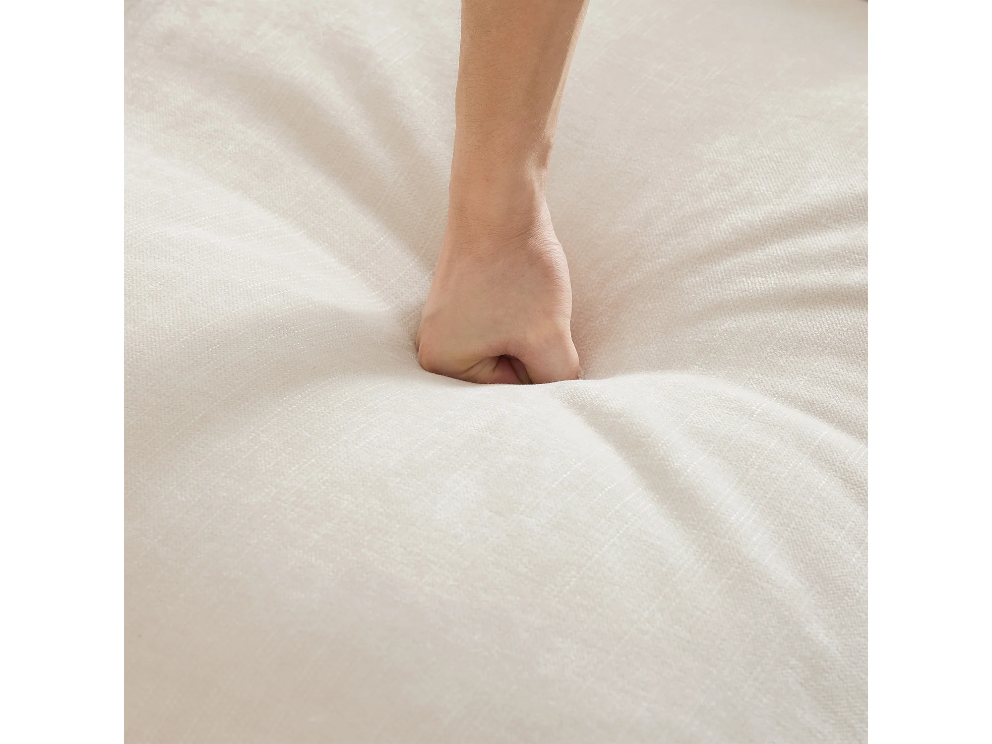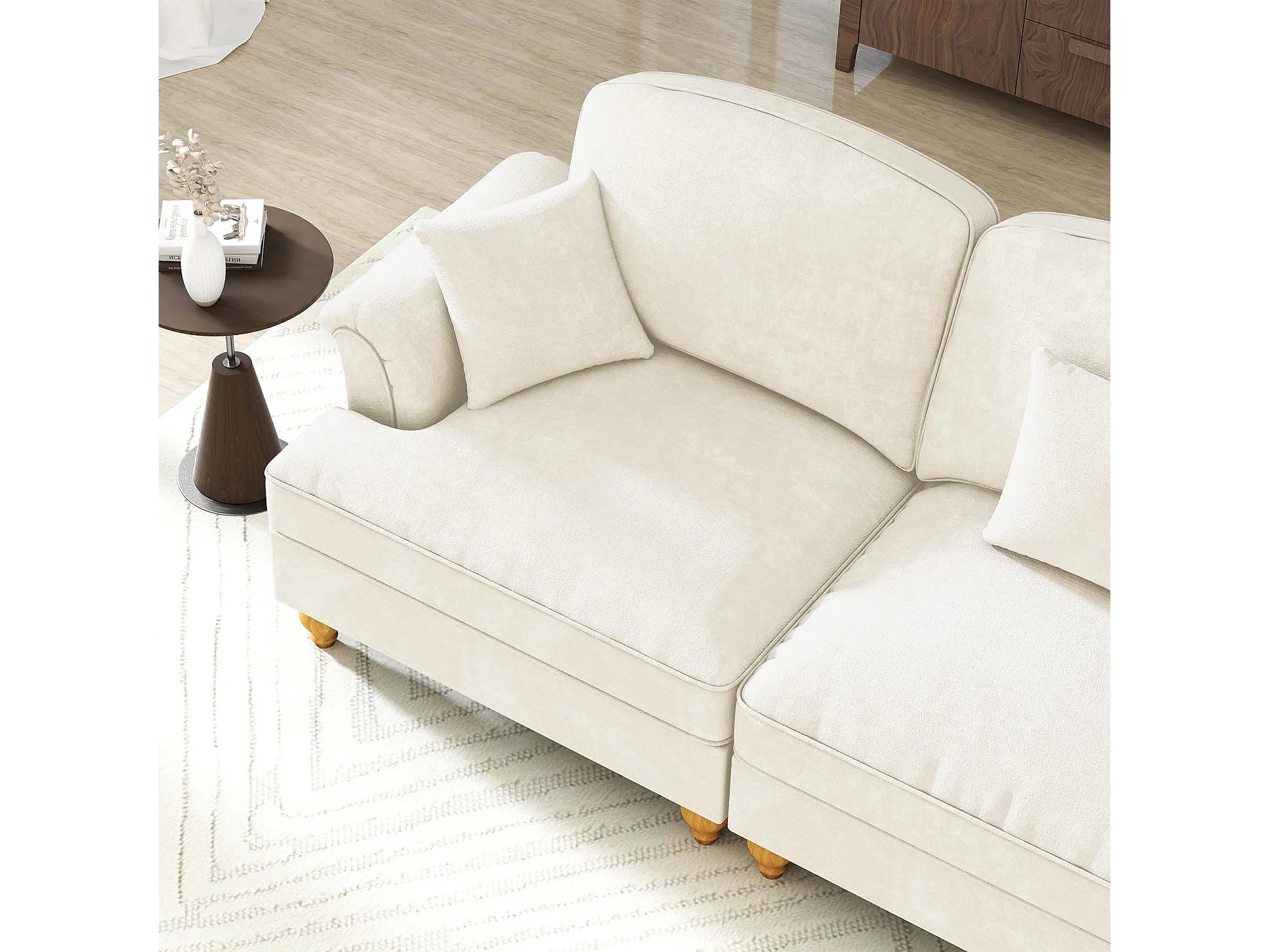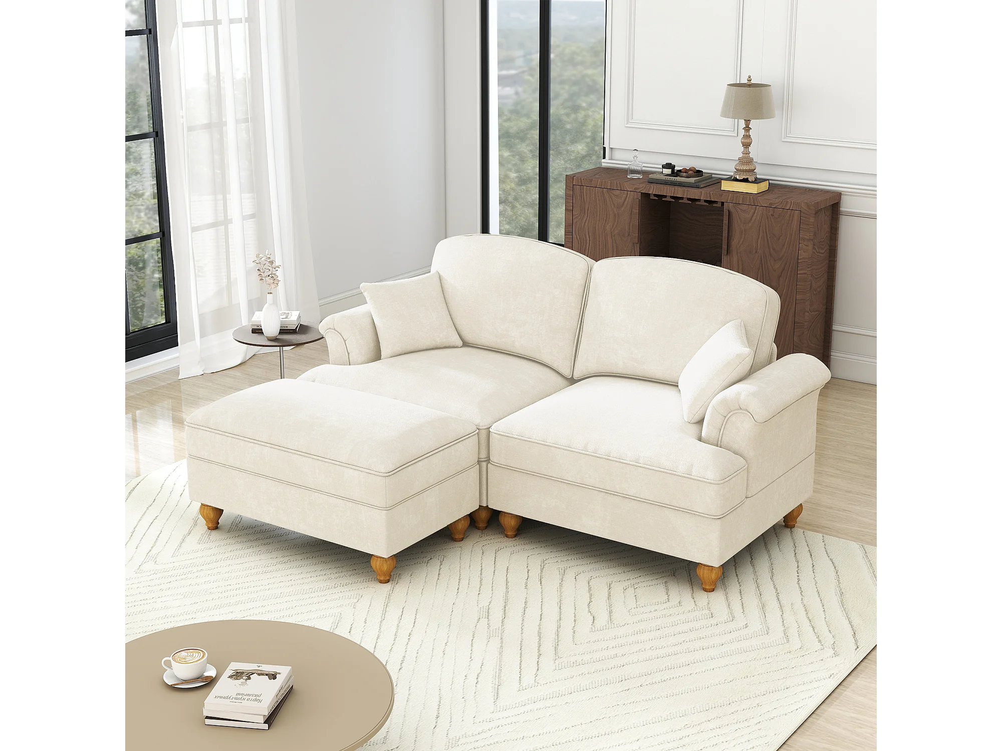 Canapé 2 places chesterfield en chenille beige - avec pouf et 2 oreillers - cantonnière amovible - 194x140x93cm