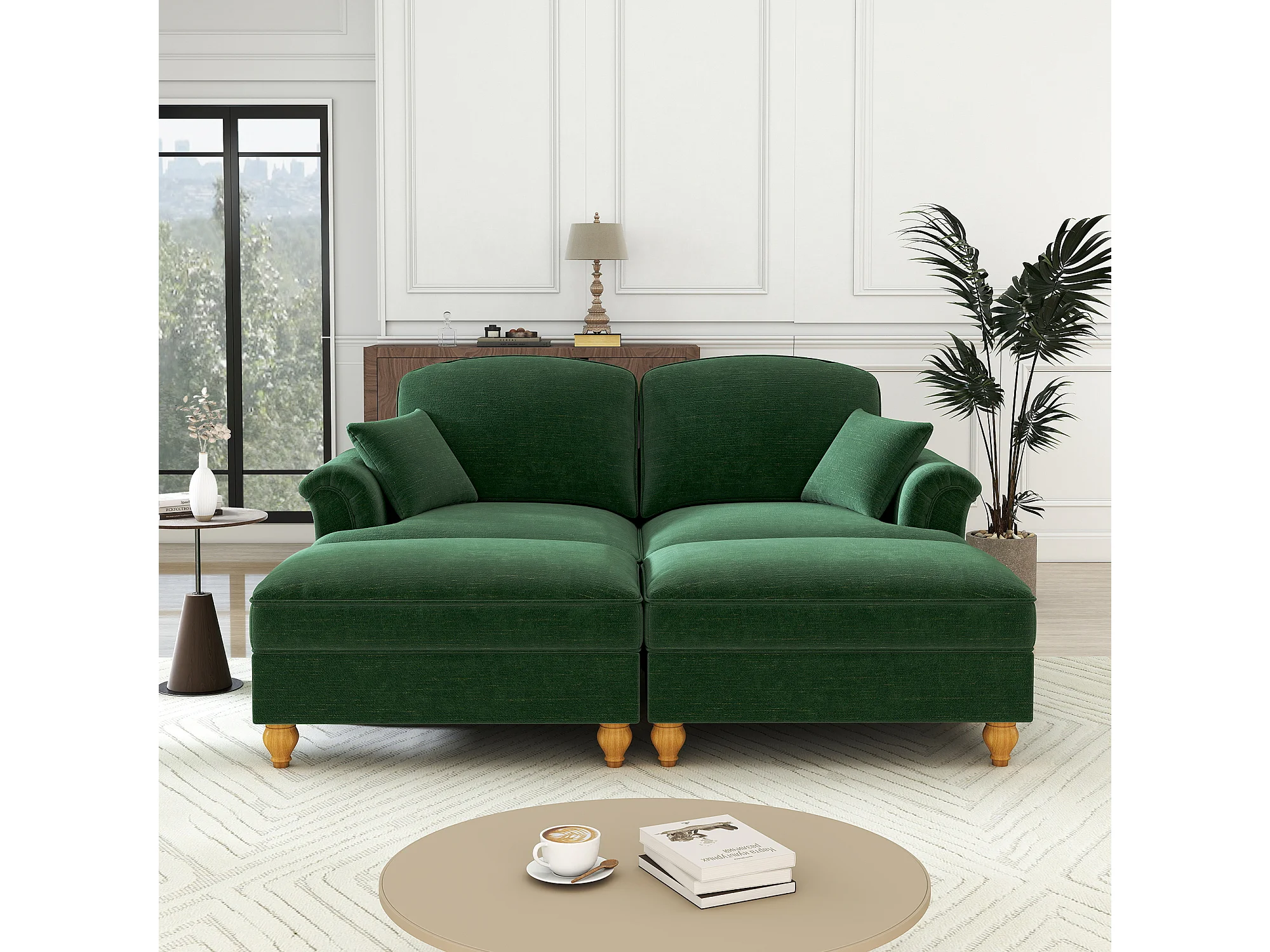 Canapé 2 places chesterfield en chenille vert - avec 2 pouf et 2 oreillers - cantonnière amovible - 194x140x93cm