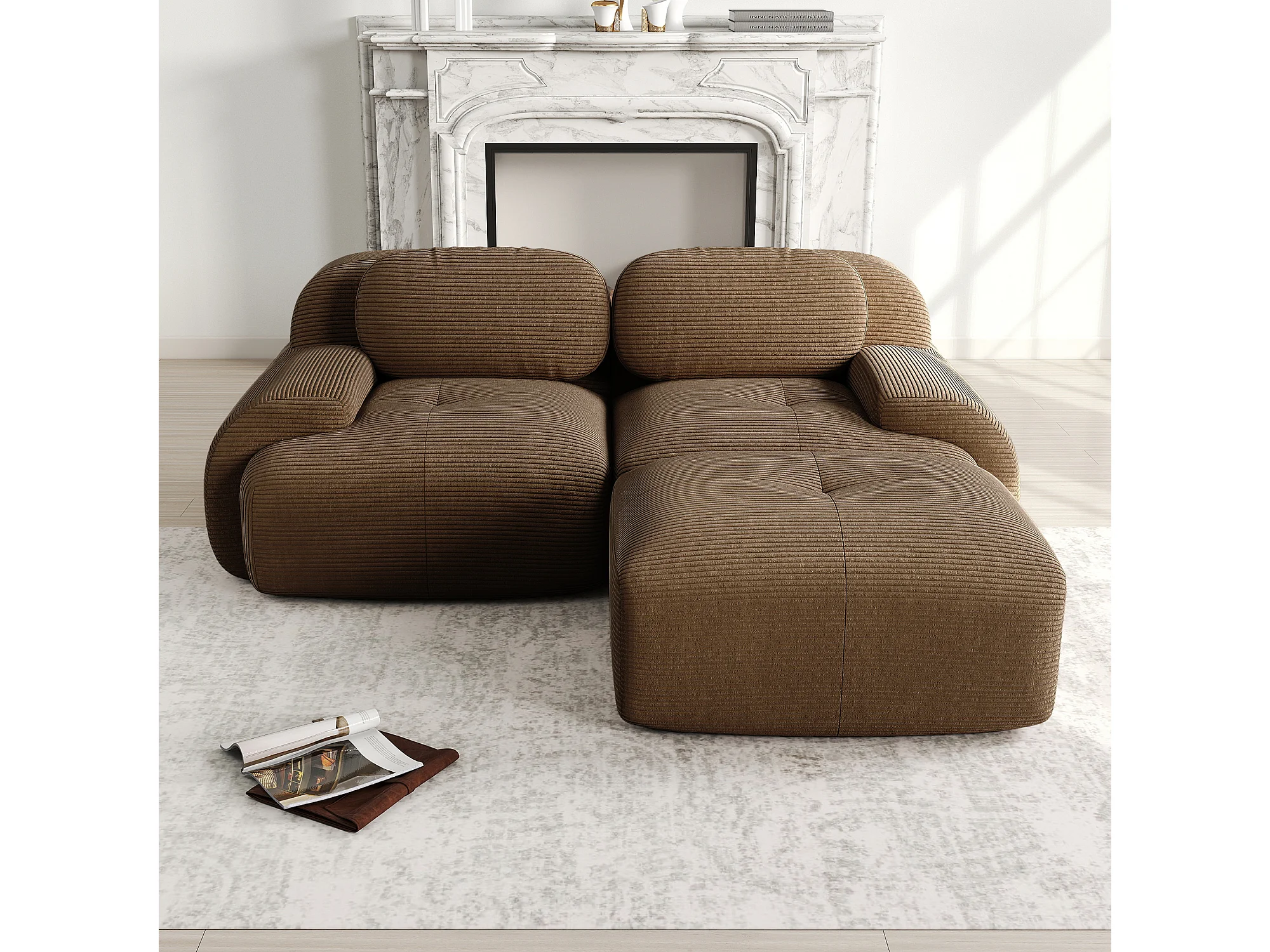 Canapé 2 places d'angle modulable - en Velours côtelé - avec 2 oreillers et pouf - ergonomique- 208x178x70cm - Marron
