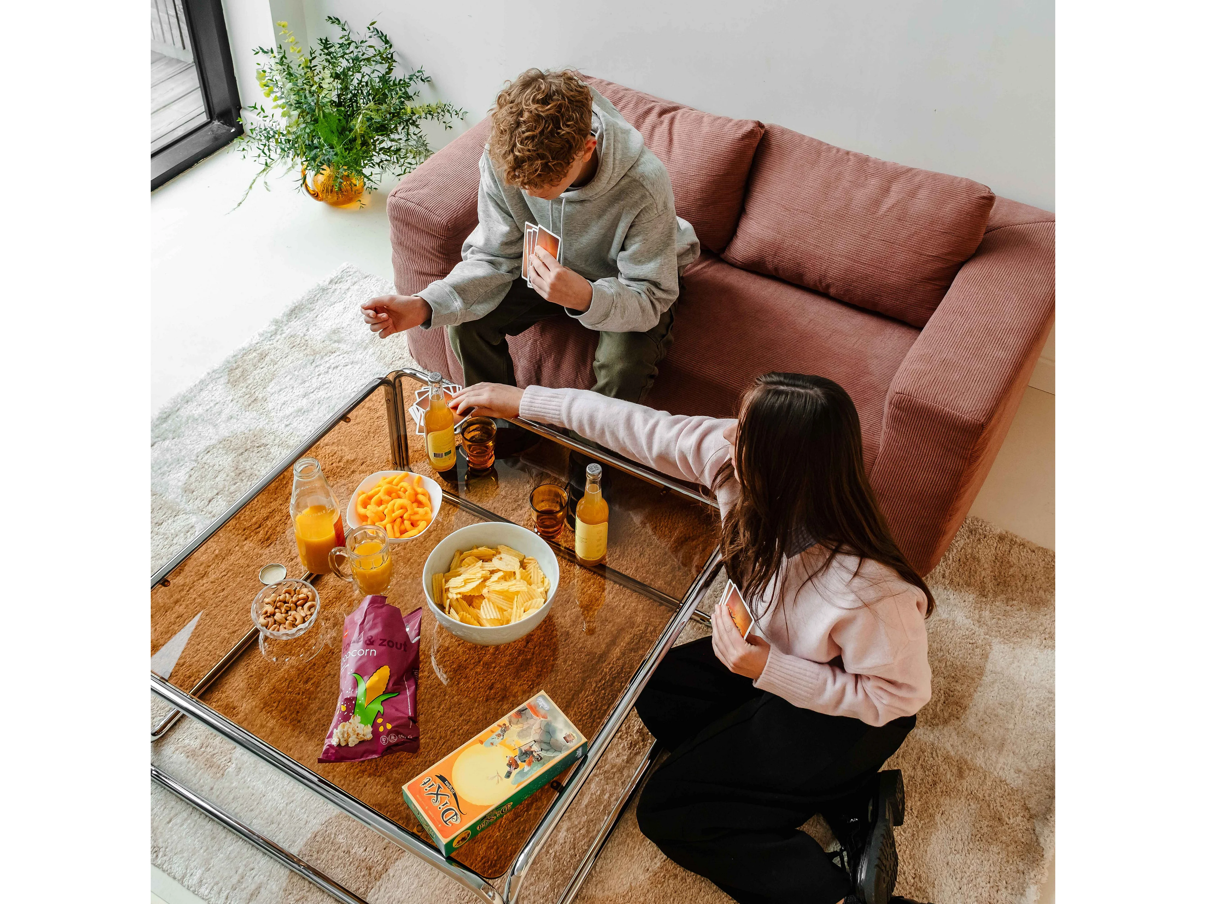 Canapé 2 places en tissu chenille rose – support téléphone – port USB et poches latérales – Idéal pour salon, bureau ou chambre