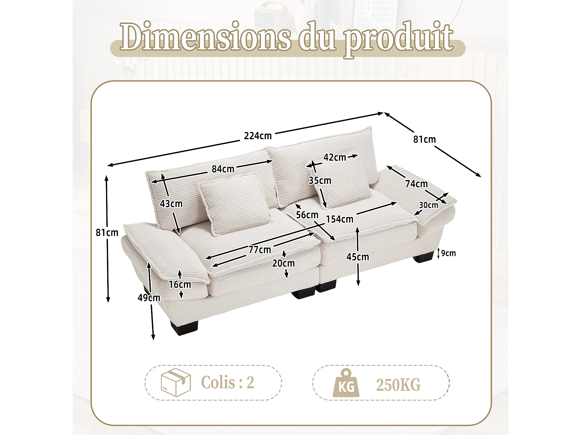 Canapé 2 places en velours beige – Double rembourrage en mousse mémoire et haute densité – 2 coussins inclus – Design minimaliste et confortable pour salon