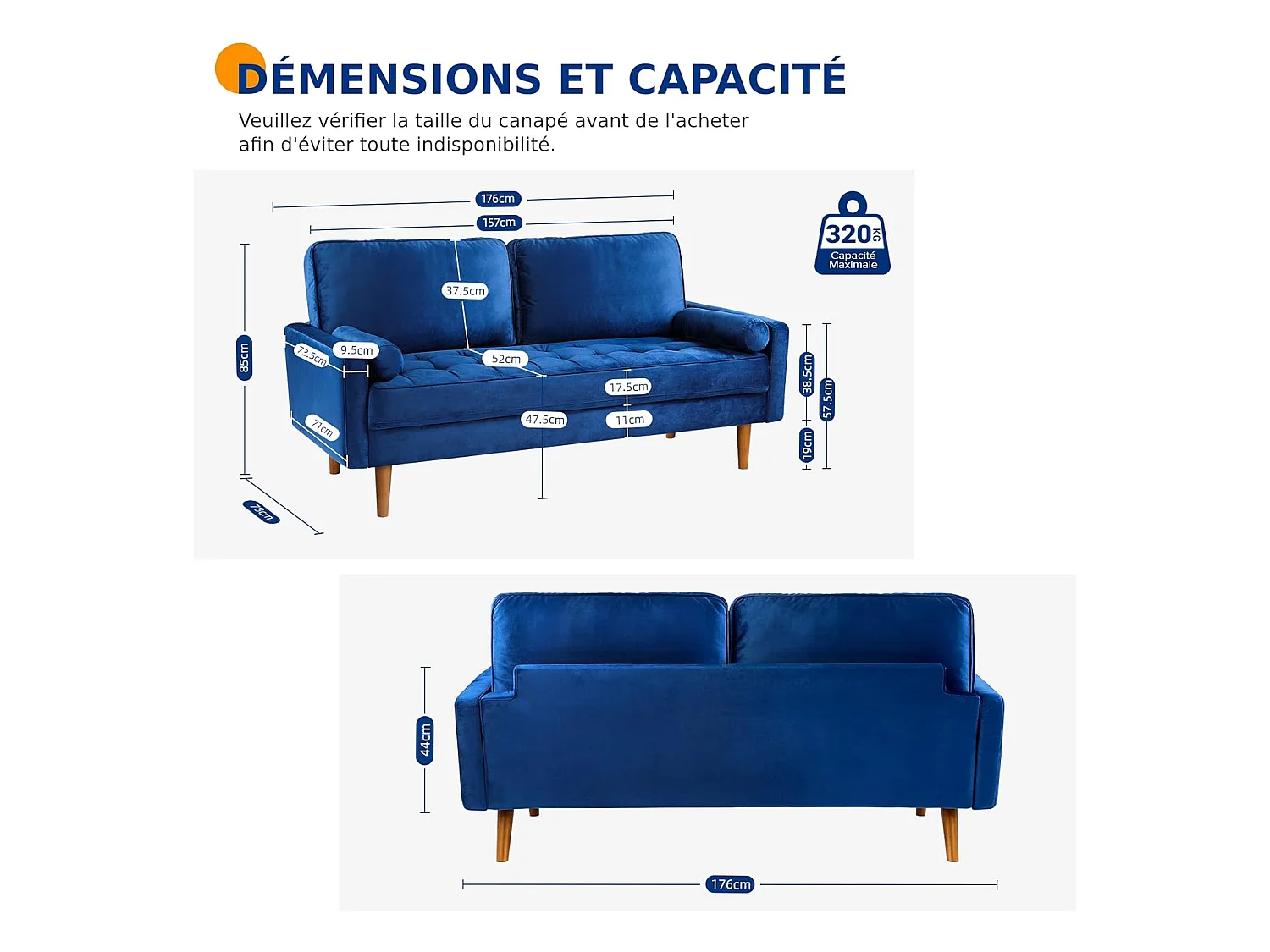 Canapé 2 places avec oreillers décoratifs bleu 120 cm velours REO24408