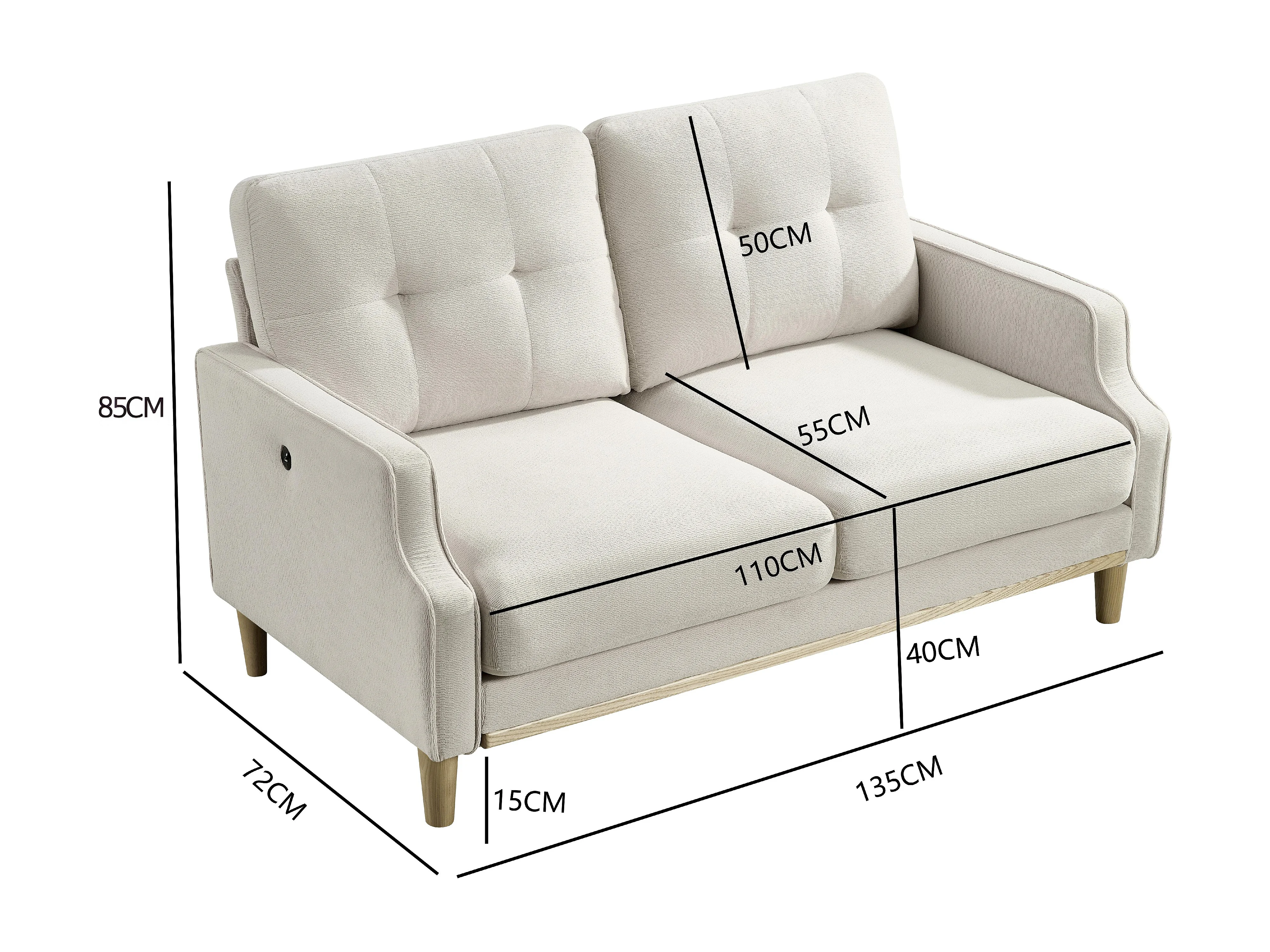 Canapé 2 places petite 135 cm avec port USB, tissu beige et bois