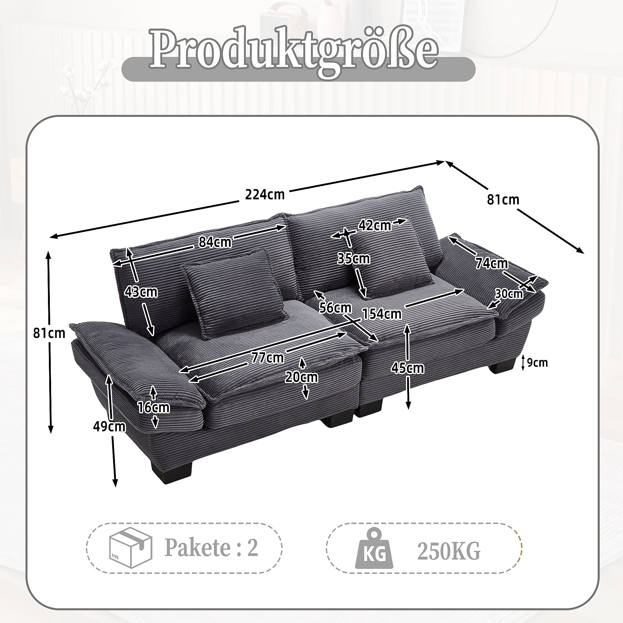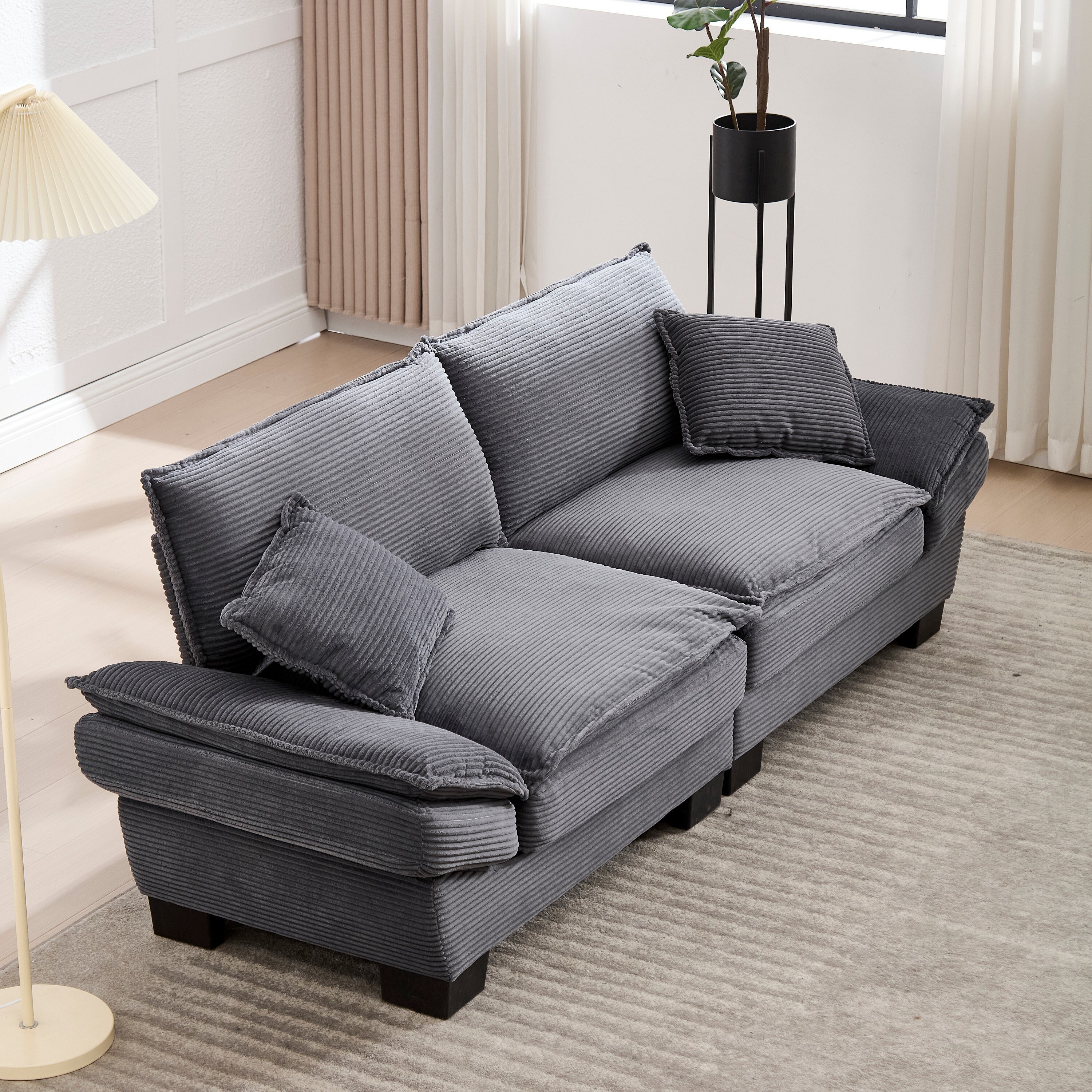 Canapé 2 places, velours, canapé gris foncé avec appui-tête et dossier, pour salon et chambre