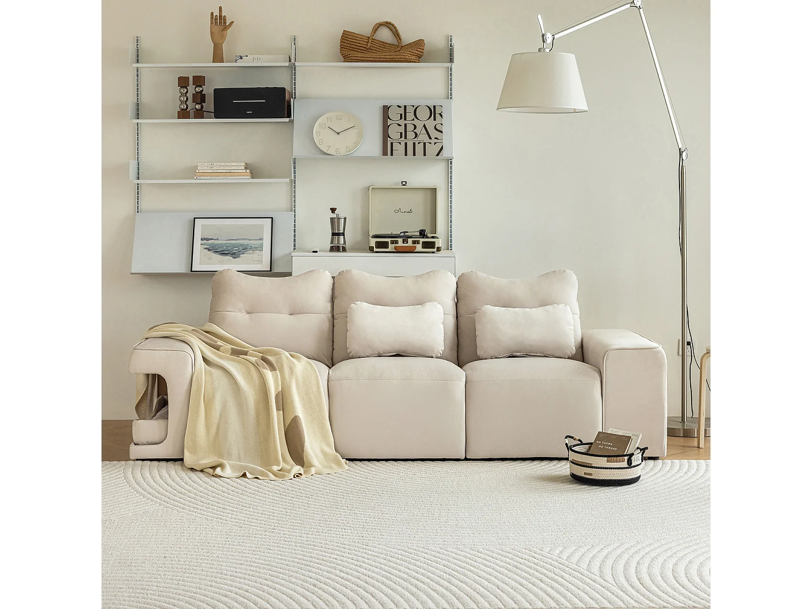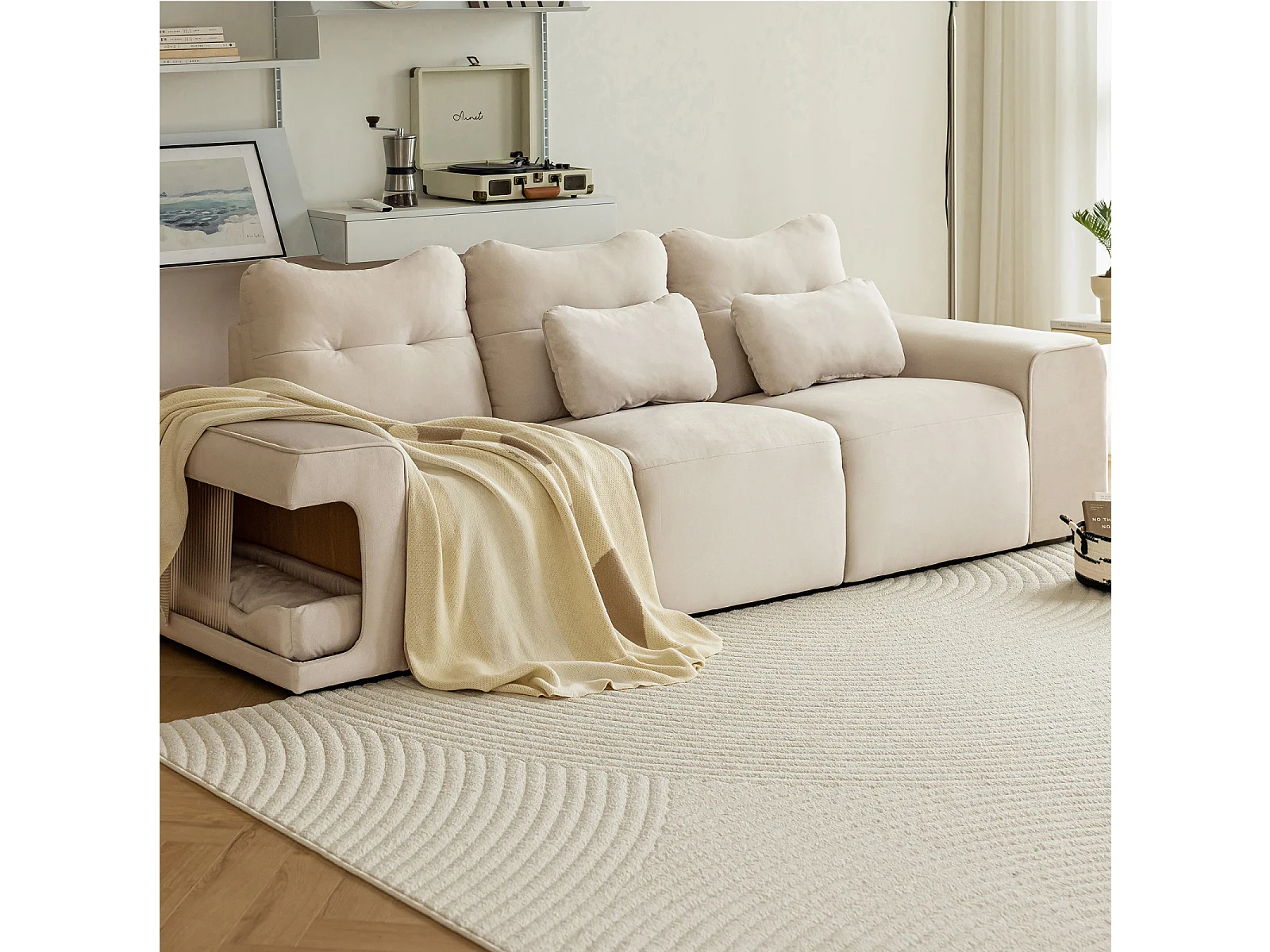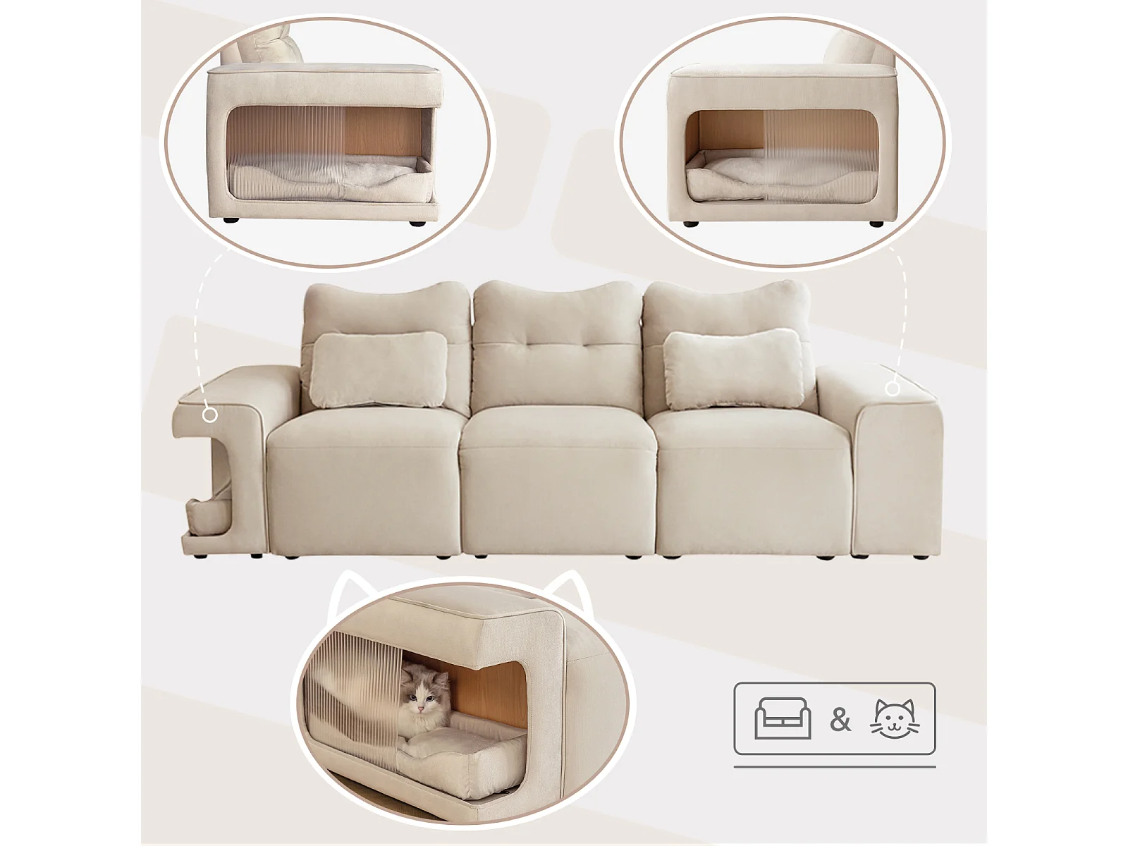 Canapé 3 places, avec 2 nids de chats et coussins, en tissu velours, style scandinave, beige 228x73x79.5cm