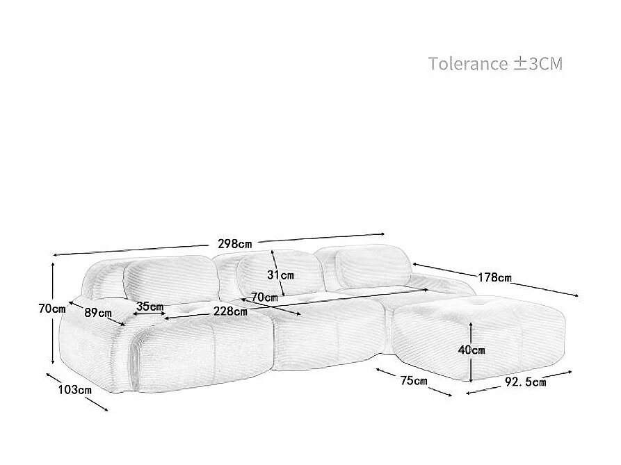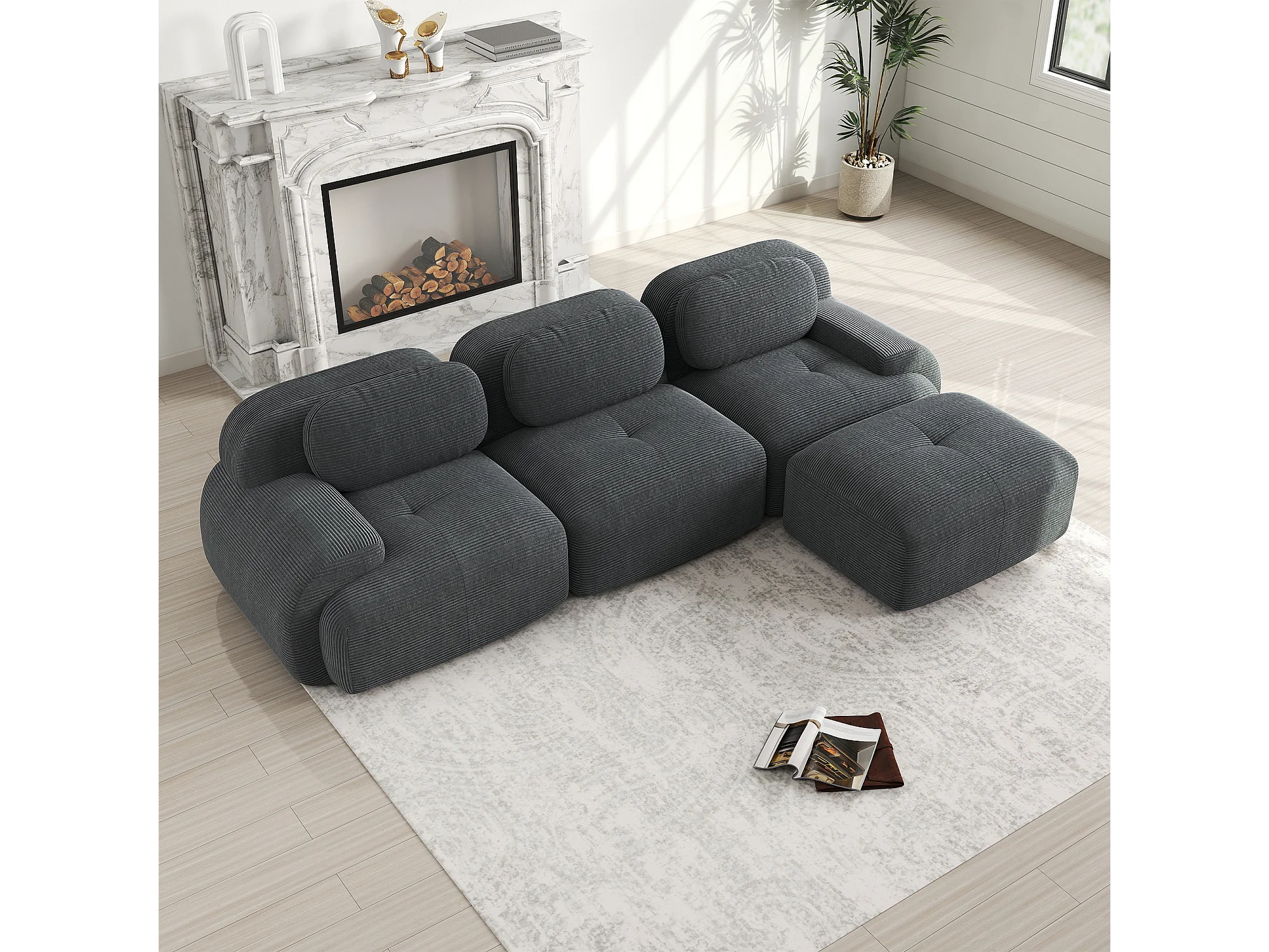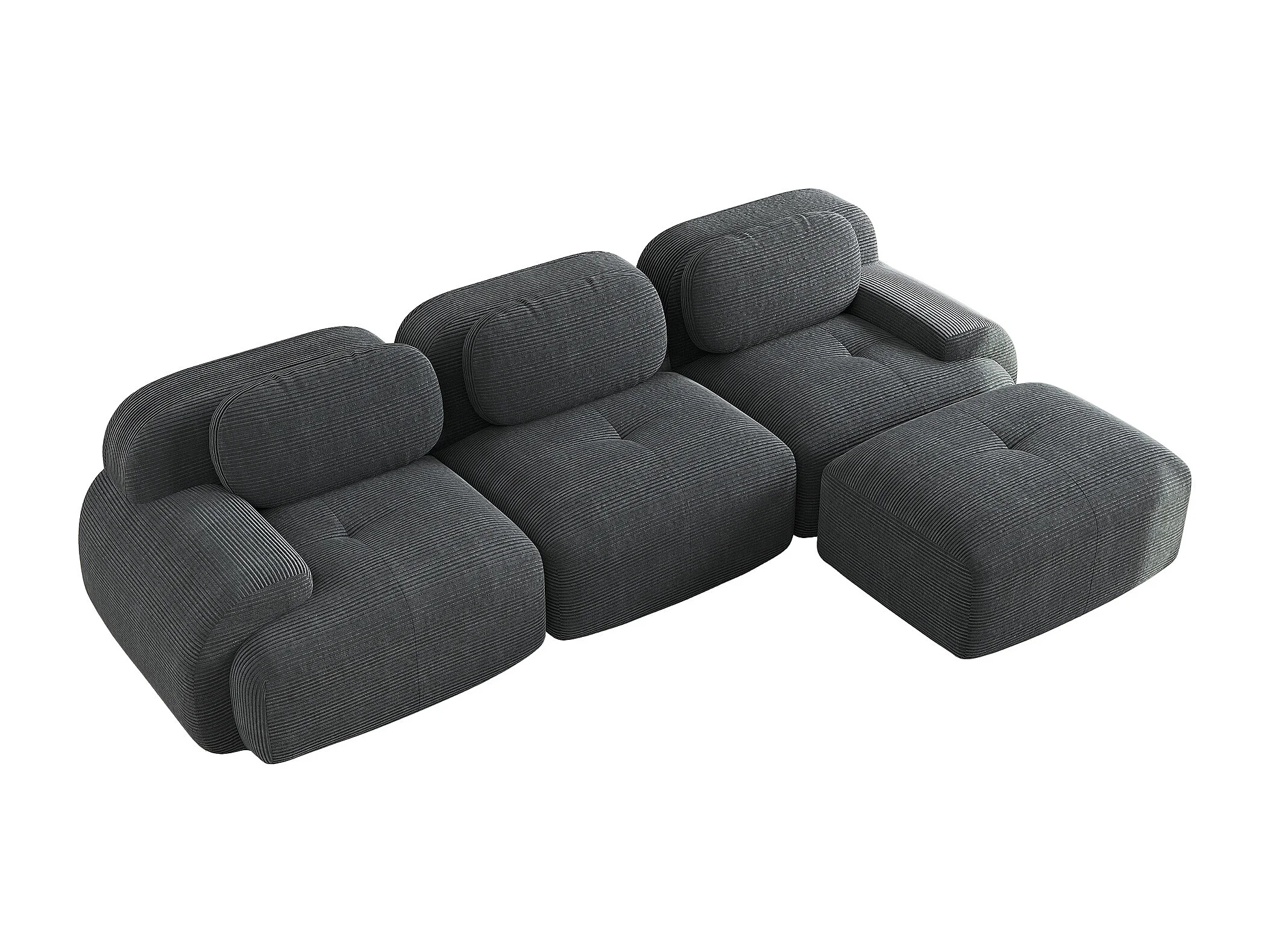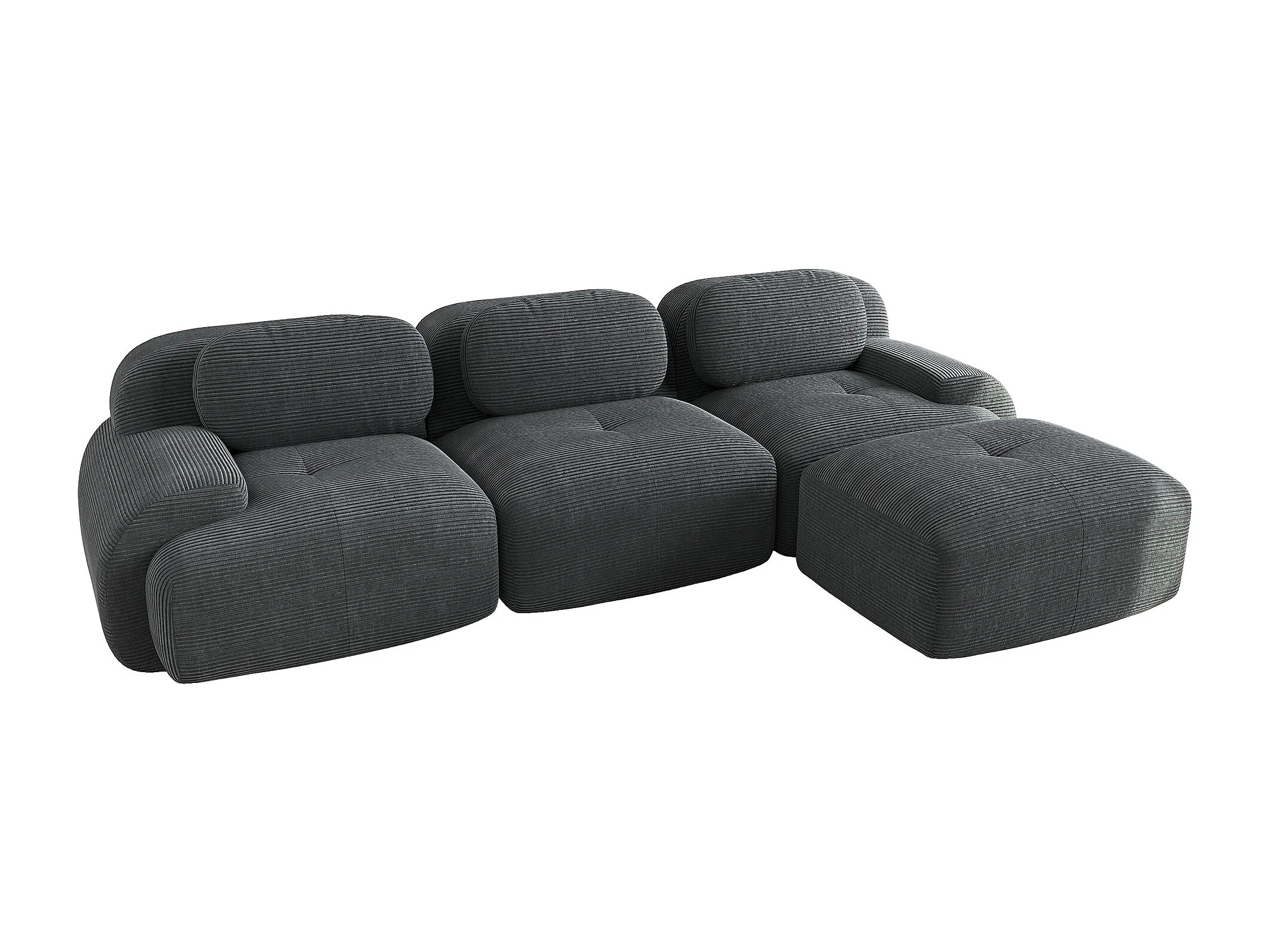 Canapé 3 places, canapé d'angle avec dossier rembourré et repose-pieds - Velours côtelé gris