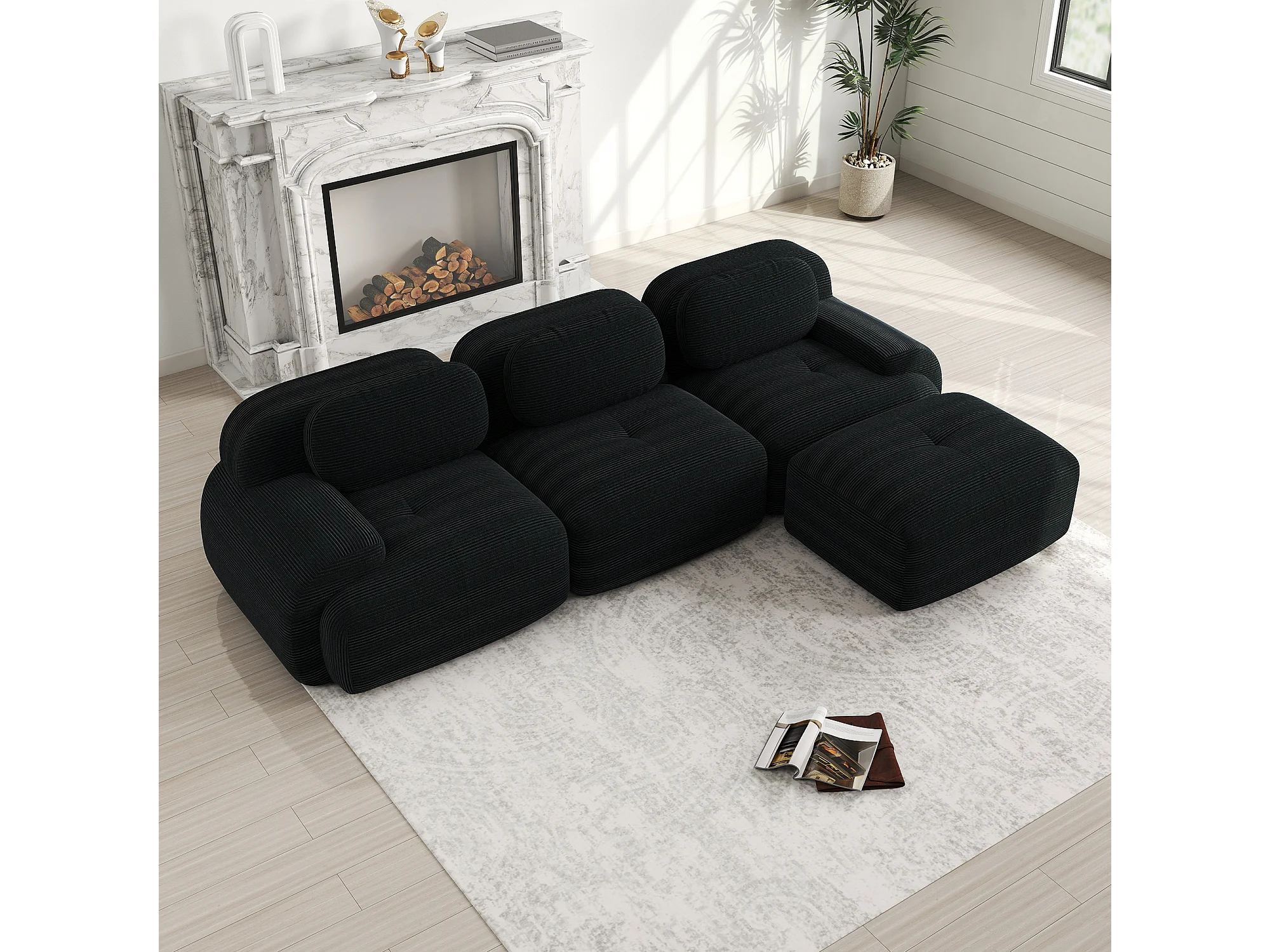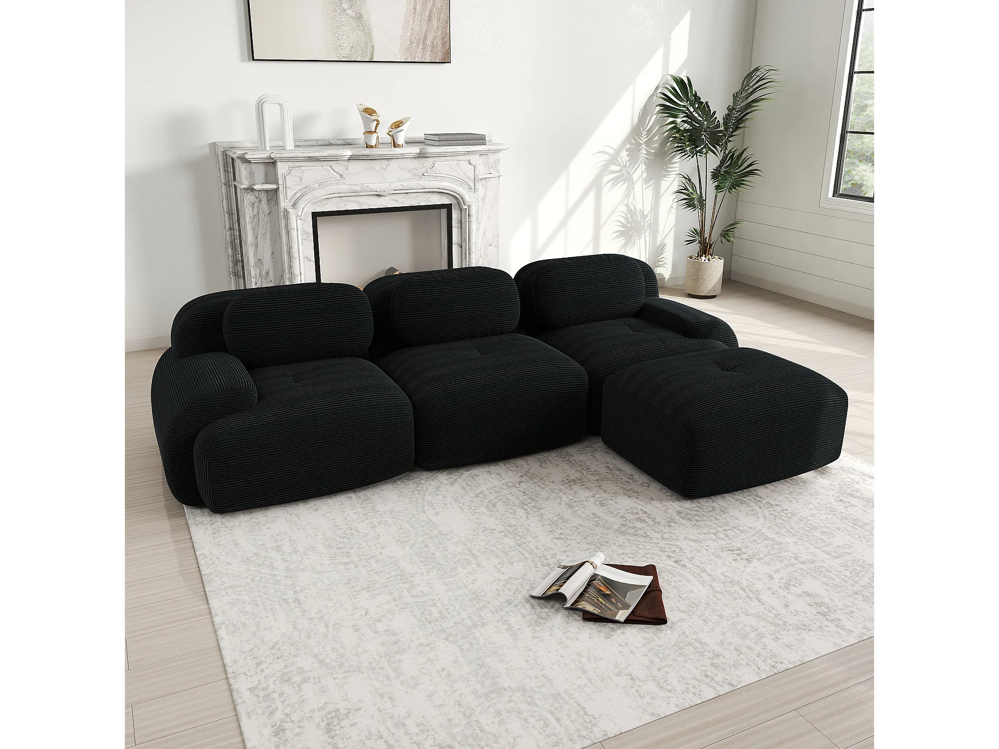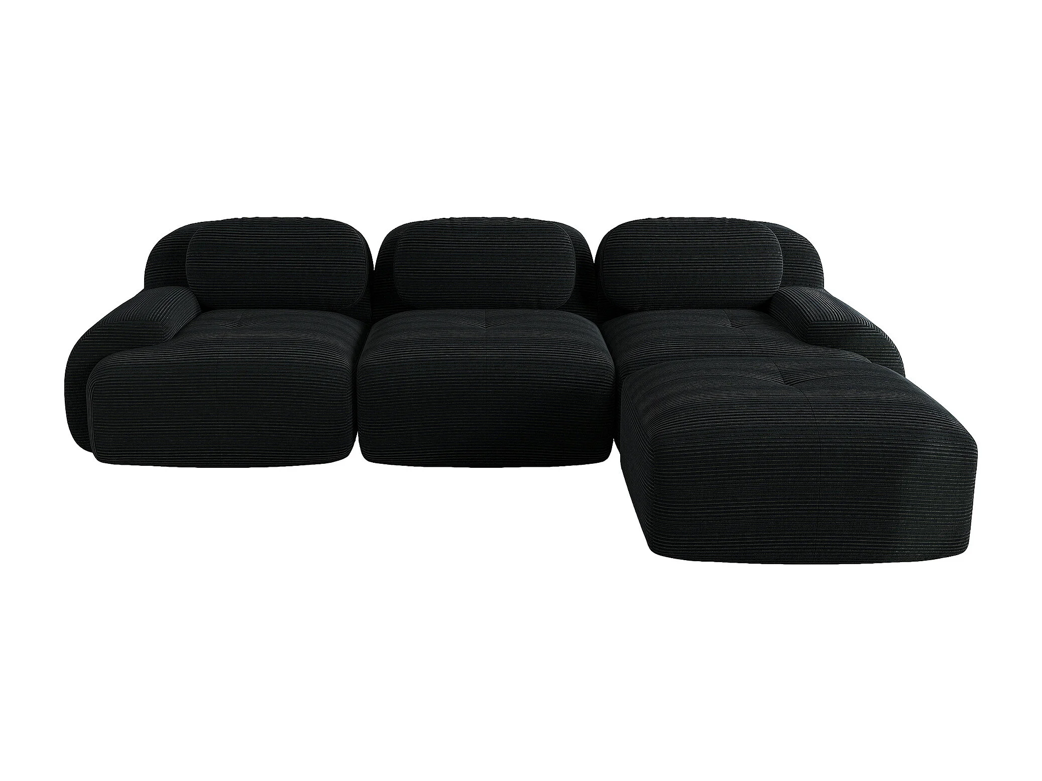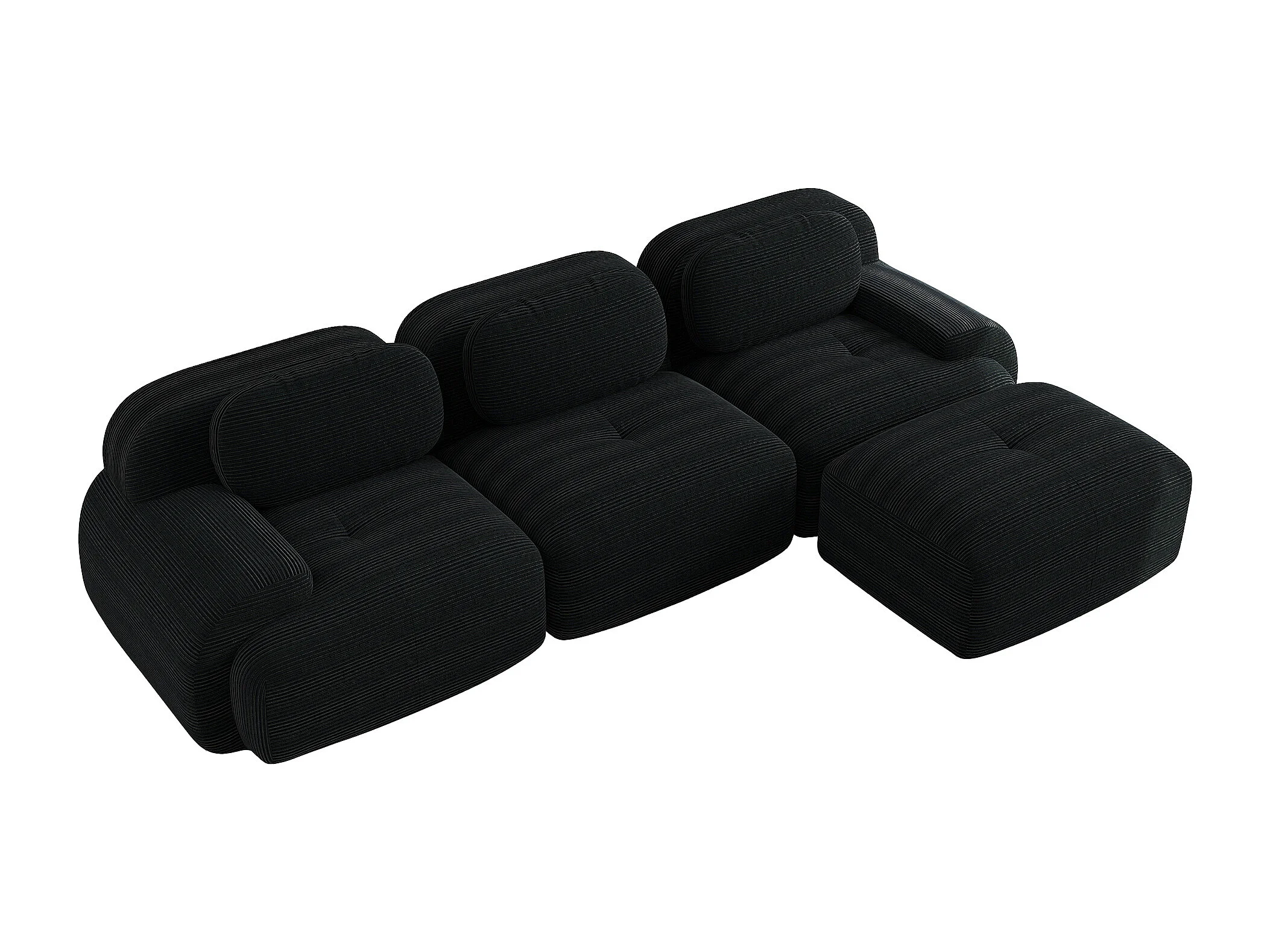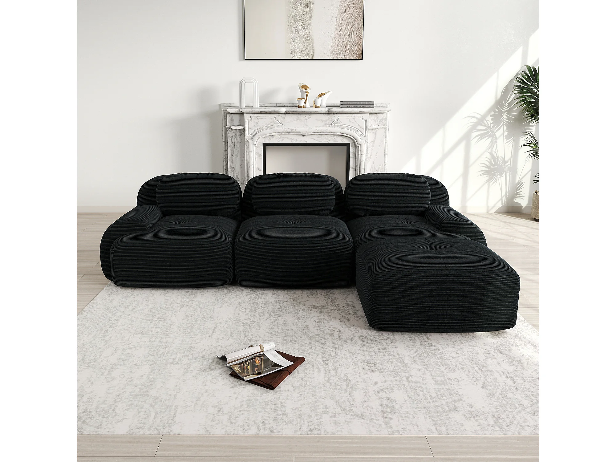 Canapé 3 places, canapé d'angle avec dossier rembourré et repose-pieds - Velours côtelé noir