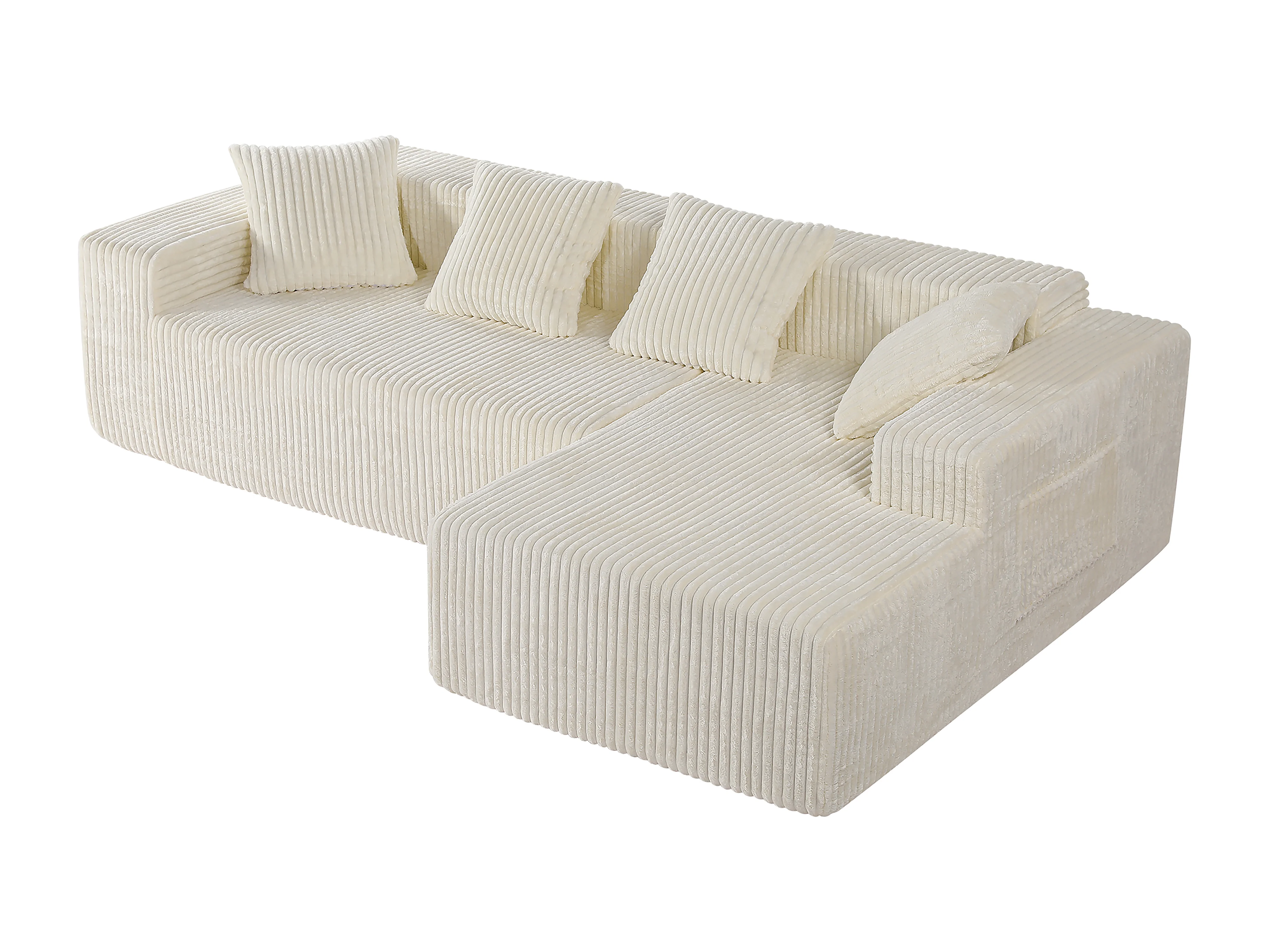 Canapé 3 Places d'angle droite modulable, en Velours côtelé beige, avec 4 Coussins, méridienne et poche latérale, 261x156x80cm