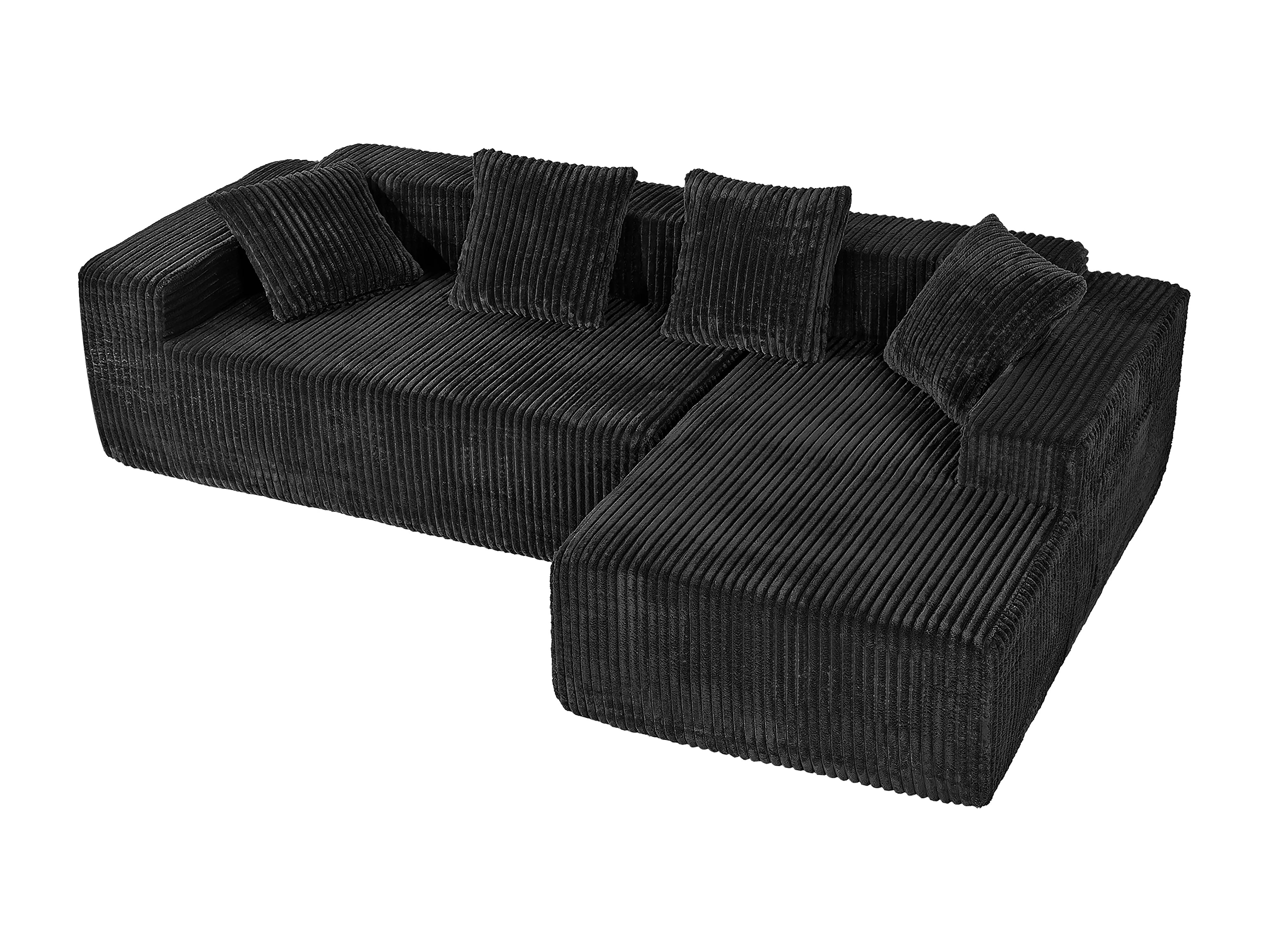 Canapé 3 Places d'angle droite modulable, en Velours côtelé noir, avec 4 Coussins, méridienne et poche latérale, 261x156x80cm