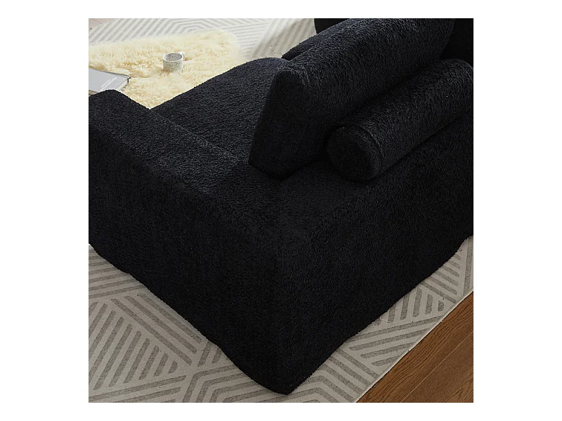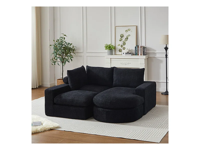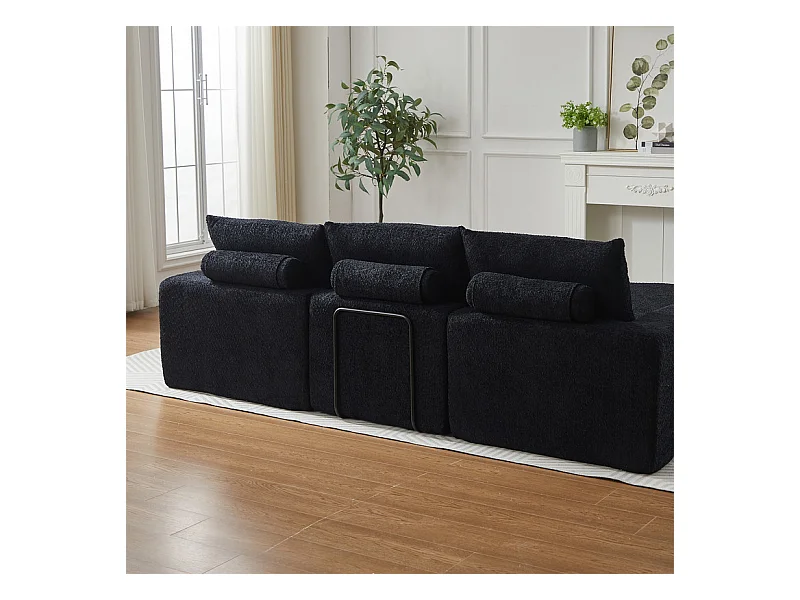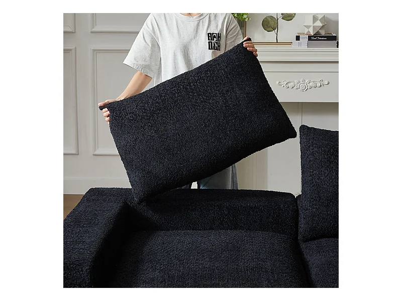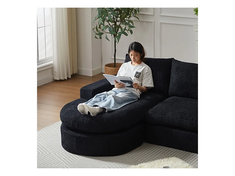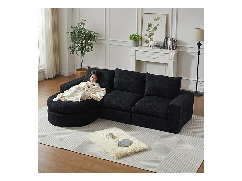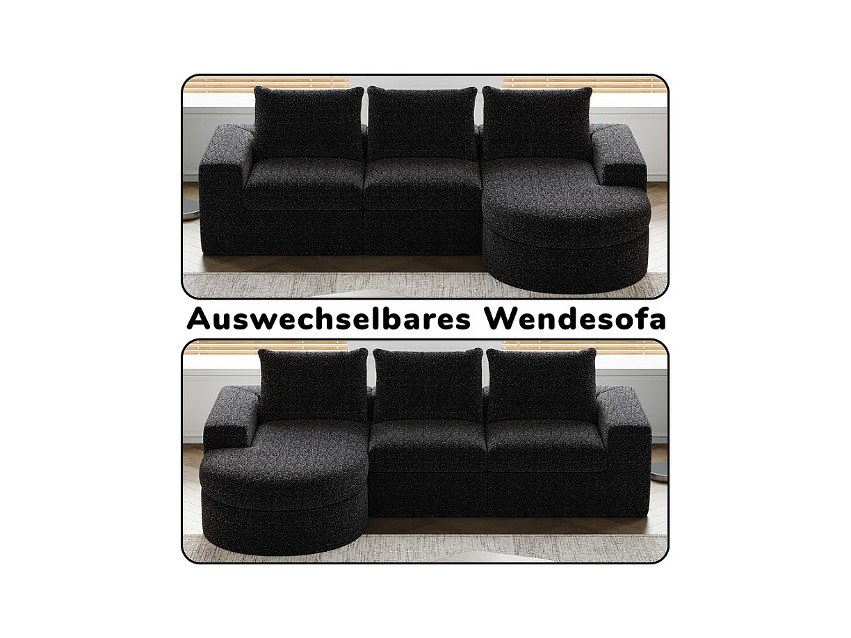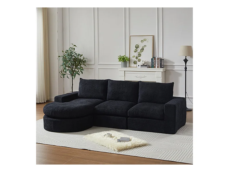 Canapé 3 places d'angle modulable, avec méridienne incurvé réversible, 3 oreillers et oreillers cervicaux, tissu chenille, Noir
