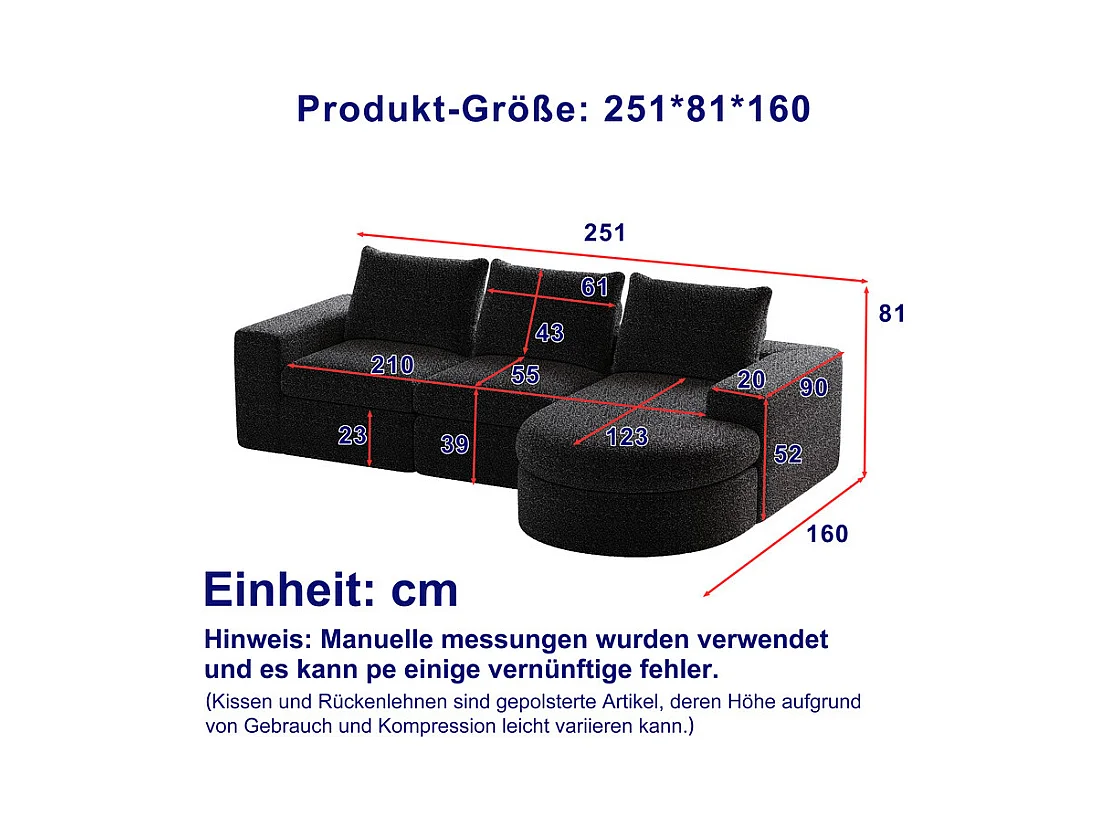 Canapé d'angle droit modulable 307cm - en Velours Côtelé grosses côtes - 3 places - avec 5 oreillers - Noir