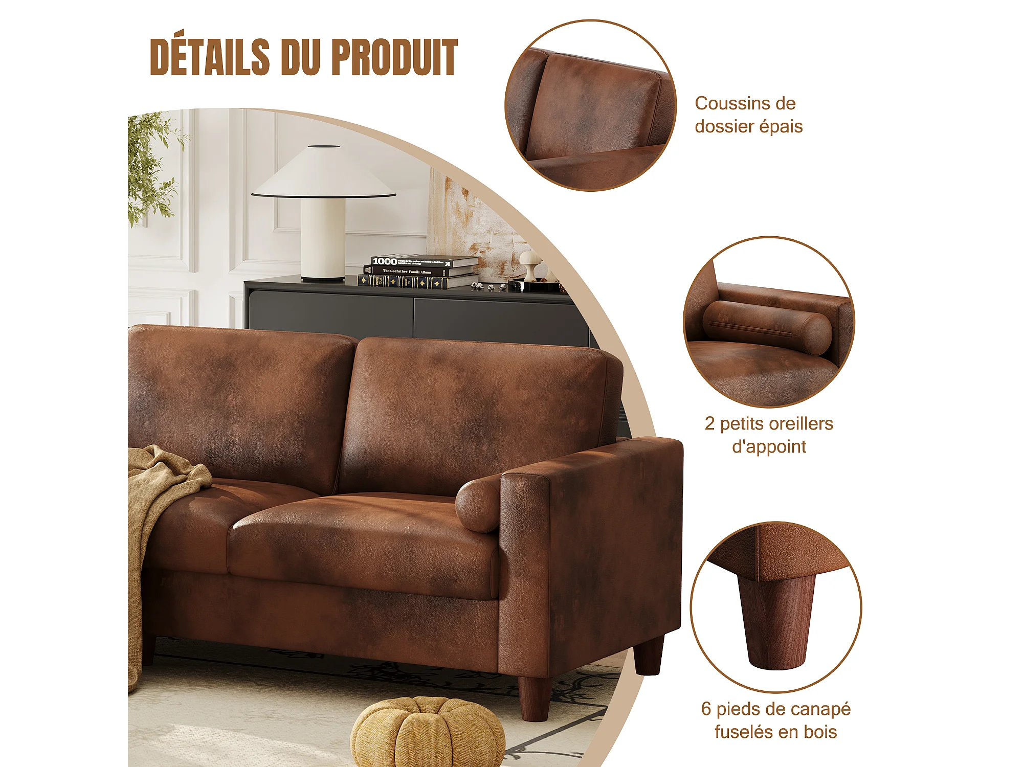 Canapé 3 places en simili, avec pouf et 2 oreillers rond, cadre en bois, 234x155x88cm, Marron