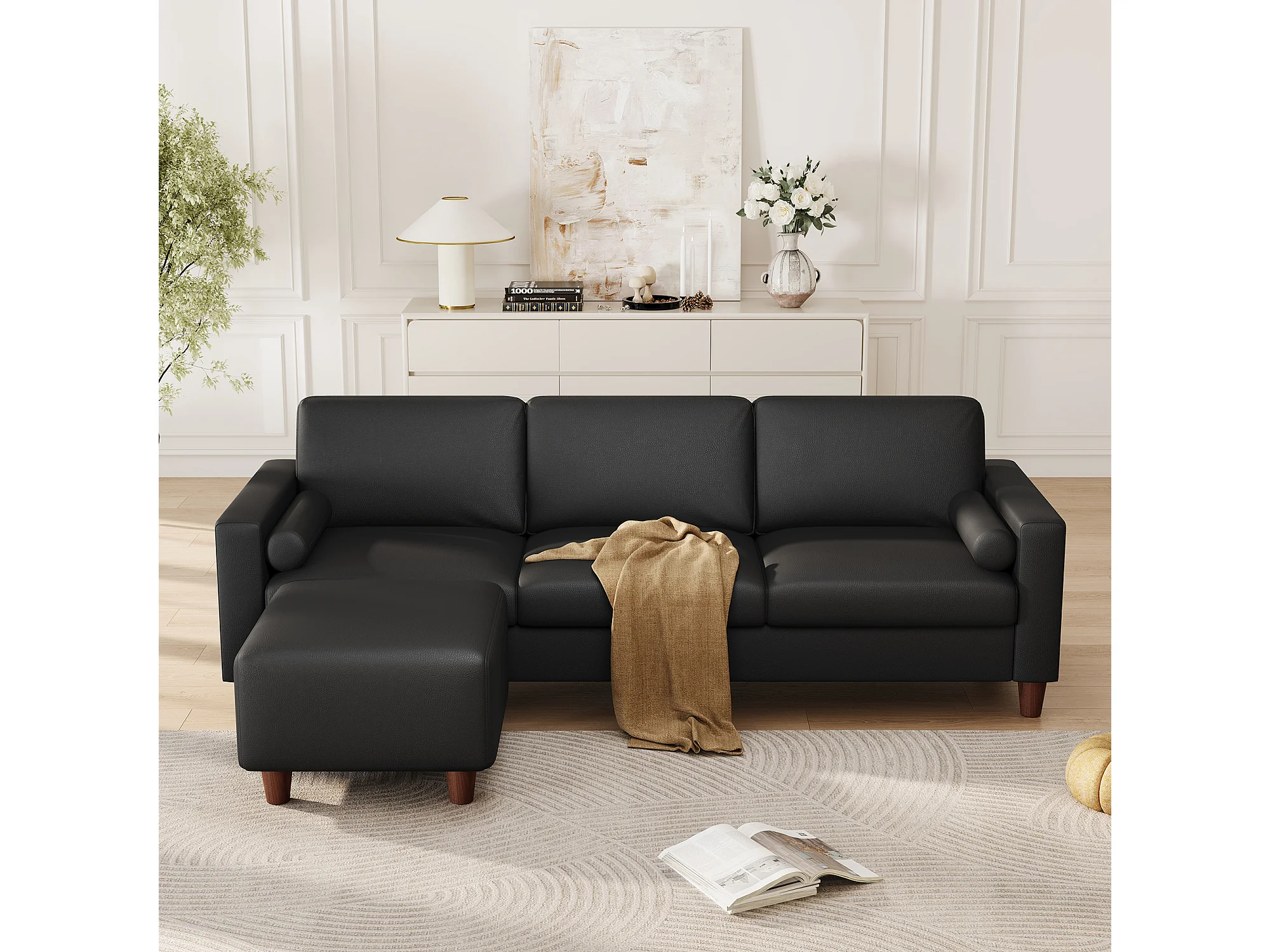 Canapé 3 places en simili, avec pouf et 2 oreillers rond, cadre en bois, 234x155x88cm, Noir