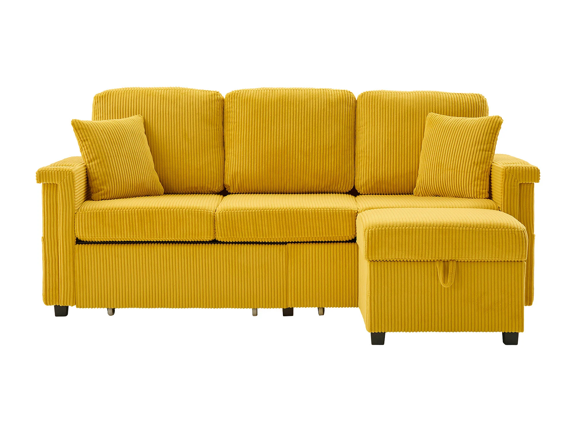 Canapé 3 places en velours côtelé jaune avec LED et USB, repose-pieds de rangement et 2 tiroirs