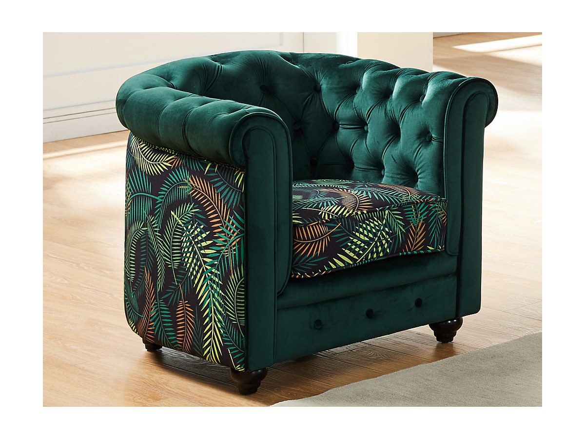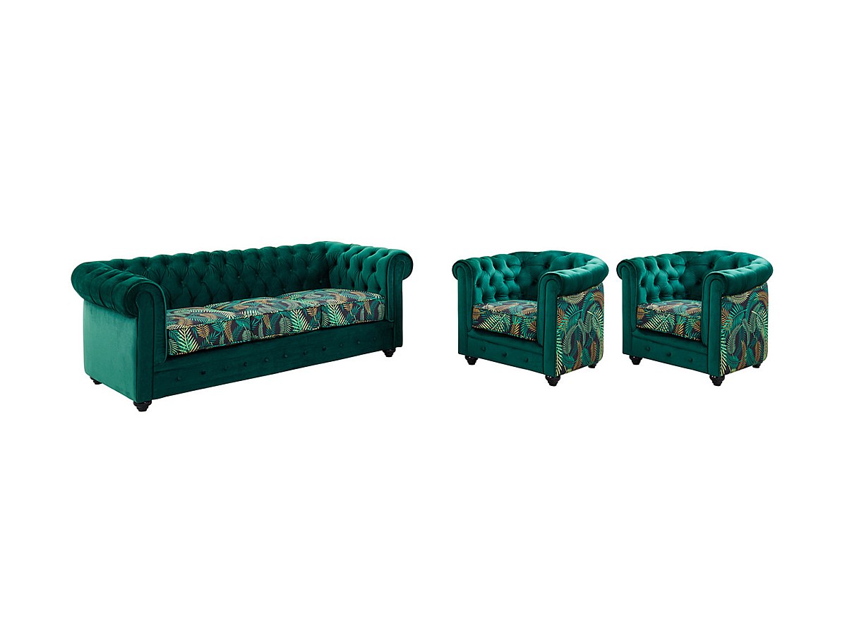 Canapé 3 places et 2 fauteuils CHESTERFIELD - Velours vert et tissu imprimé tropical