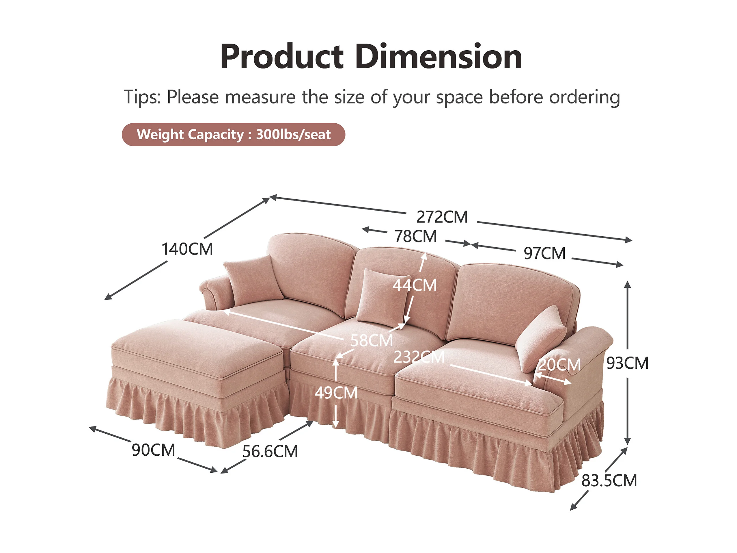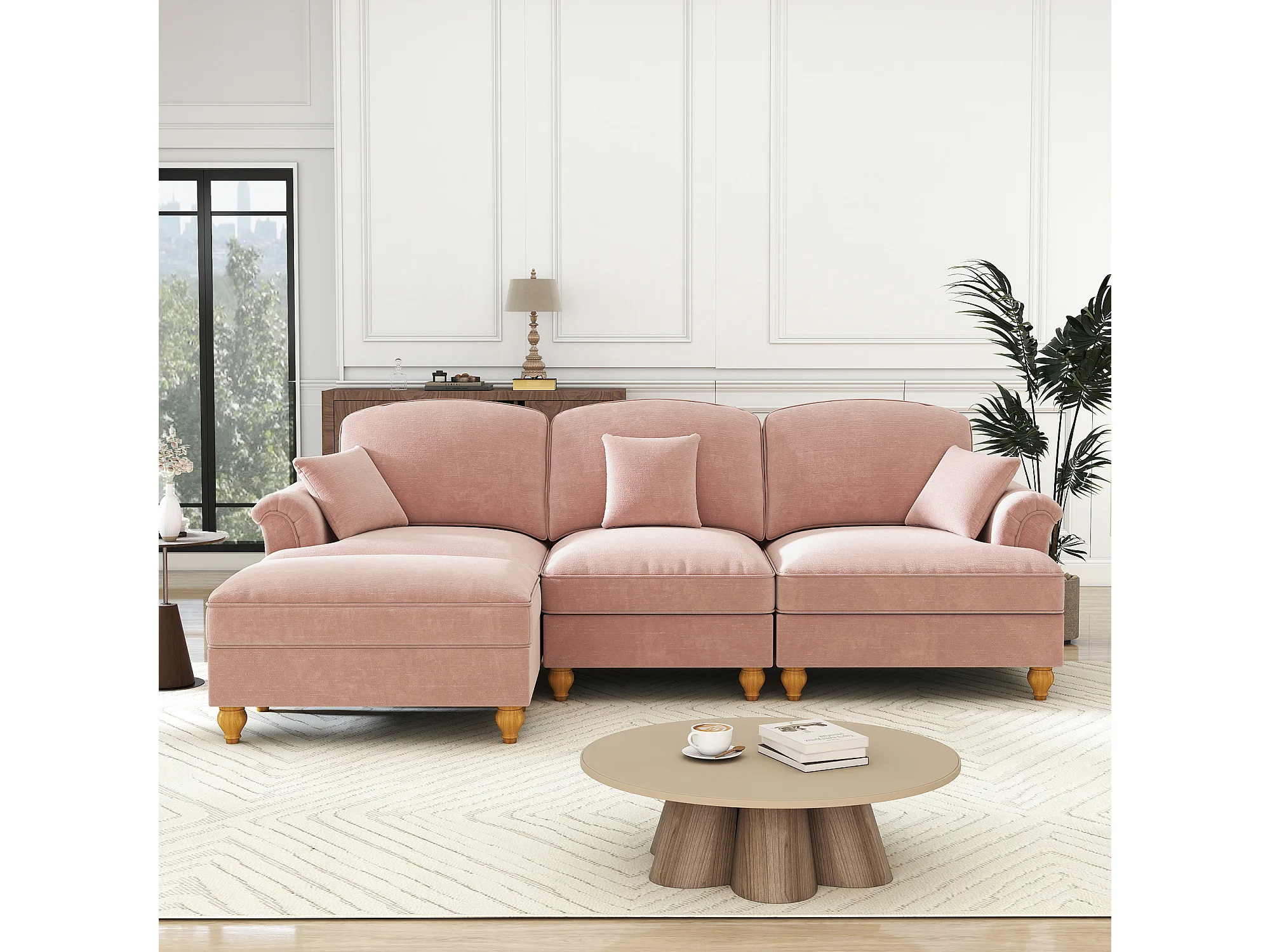 Canapé d'angle modulable, deux styles, housses à volants amovibles, chenille rose