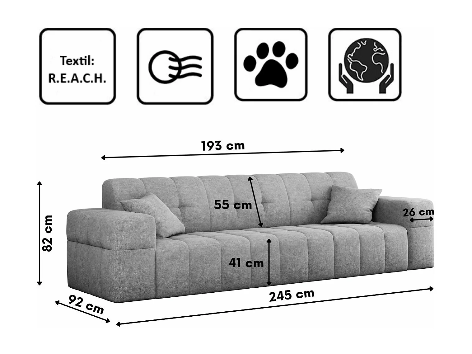 Sofa 3-Sitzer, Komfort Couch BALOO, stoff Schenille, Hellgrau