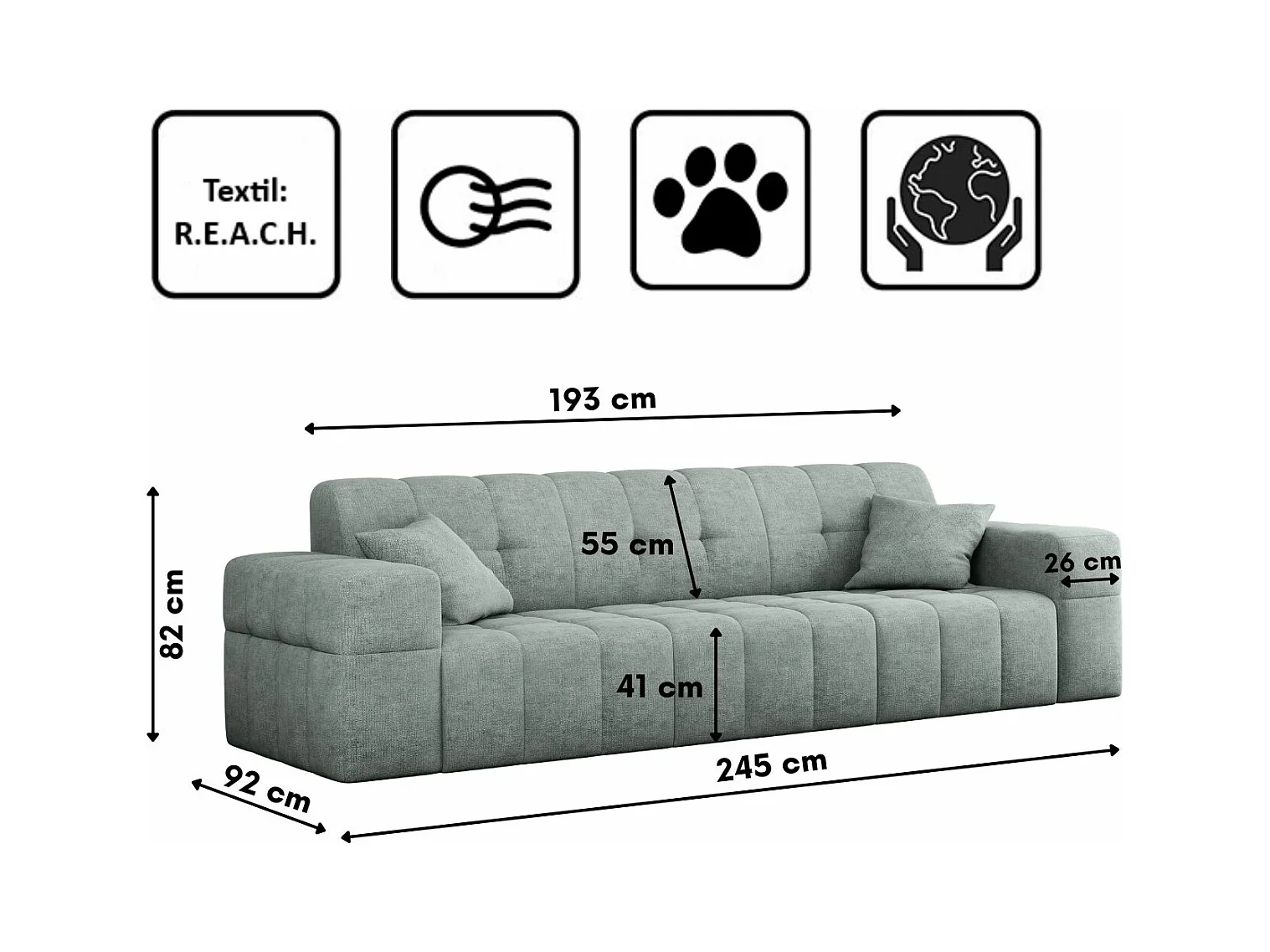 Sofa 3-Sitzer, Komfort Couch BALOO, stoff Schenille & Bouclé, Grün