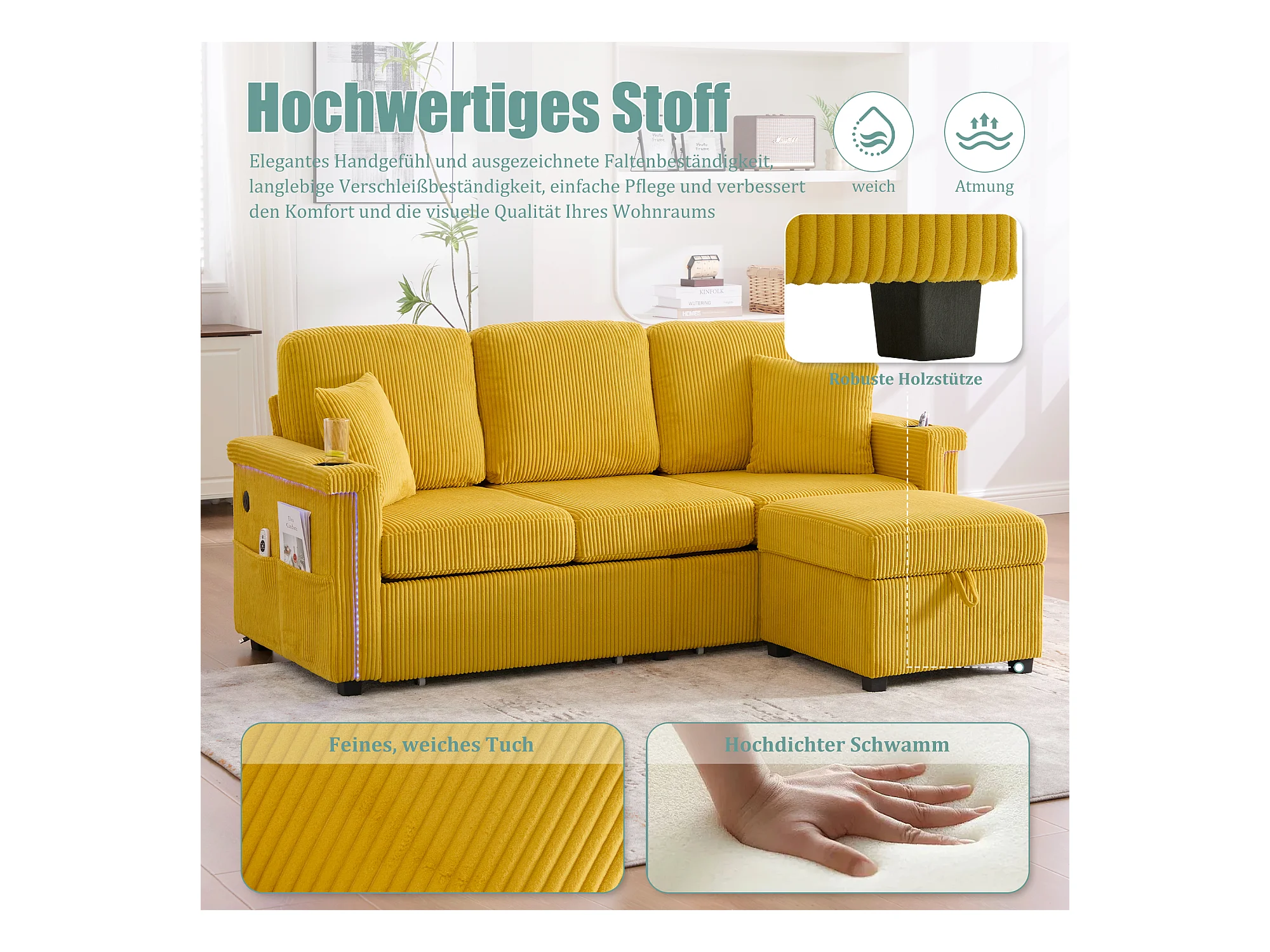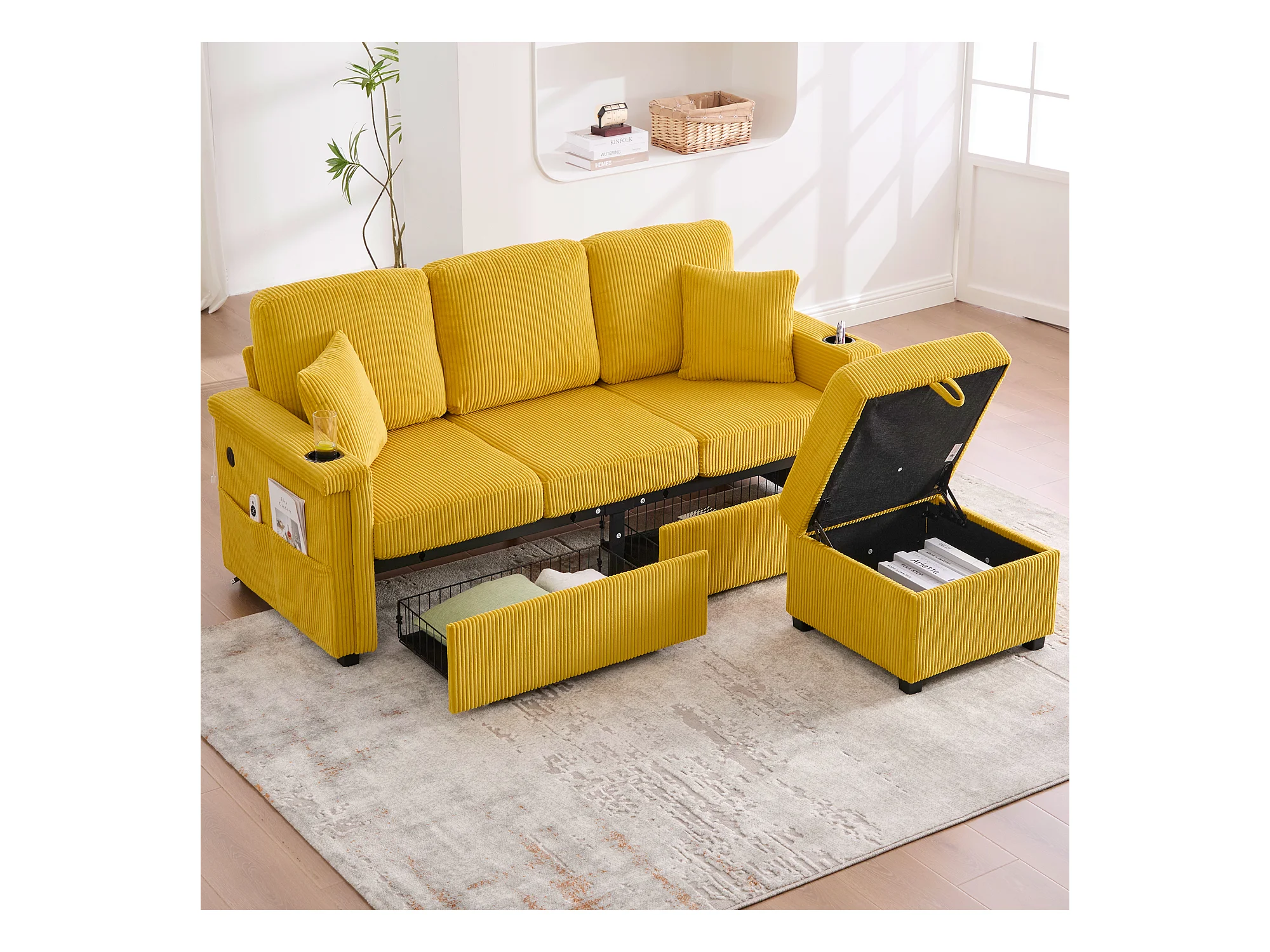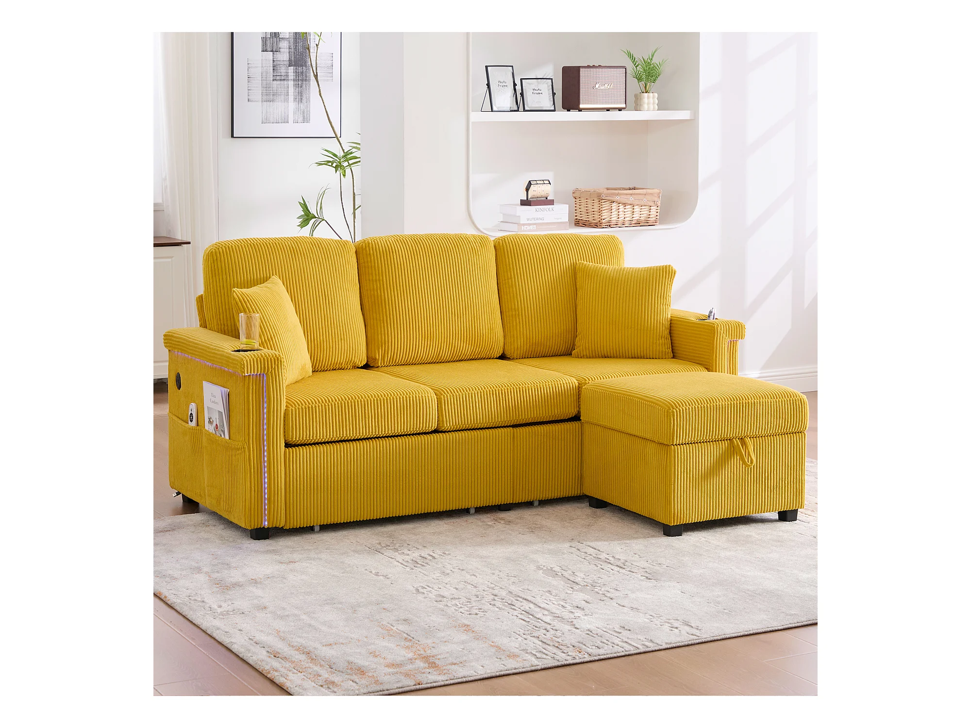 Canapé 4 places - 194 x 73 x 81 cm - avec Leds + USB + repose-pieds avec rangement + 2 tiroirs - Velours - jaune